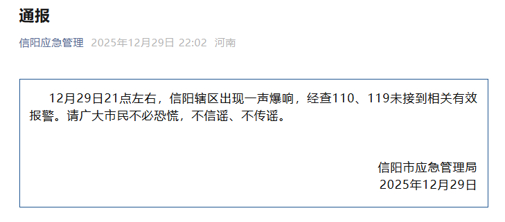 【官方通报信阳出现一声巨响】12月29日晚,多名网友称在信阳听到巨响。刚刚,信阳