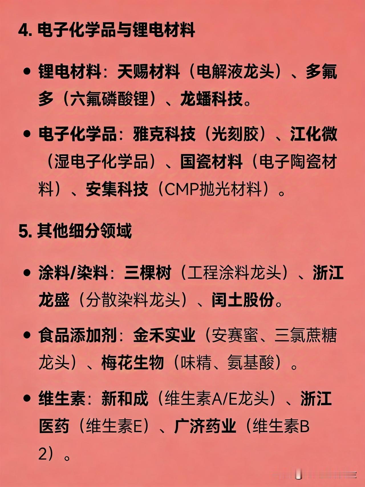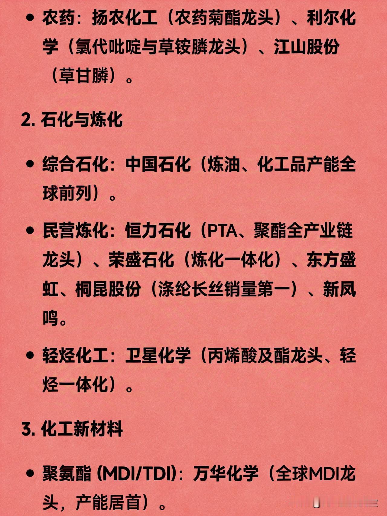 化工概念细分领域龙头汇总 1. 基础化工与农化 磷化工:云天化(磷肥龙头)、兴发集团(草甘膦、湿法磷酸)、湖北宜化(磷肥、尿素)、川恒股份(湿法磷酸)、川发龙蟒(工业级磷酸一铵)。 煤化工:华鲁恒升(煤头尿素、DMF龙头)、宝丰能源(煤制烯烃龙头)、鲁西化工(化肥、PVC)。 纯碱/烧碱:三友化工(纯碱龙头)、山东海化(溴素、纯碱)、远兴能源(天然碱)。 钾肥:盐湖股份(国内最大钾肥生产商)、亚钾国际(亚洲单体储量最大)。 农药:扬农化工(农药菊酯龙头)、利尔化学(氯代吡啶与草铵膦龙头)、江山股份(草甘膦)。 2. 石化与炼化 综合石化:中国石化(炼油、化工品产能全球前列)。 民营炼化:恒力石化(PTA、聚酯全产业链龙头)、荣盛石化(炼化一体化)、东方盛虹、桐昆股份(涤纶长丝销量第一)、新凤鸣。 轻烃化工:卫星化学(丙烯酸及酯龙头、轻烃一体化)。 3. 化工新材料 聚氨酯 (MDI/TDI):万华化学(全球MDI龙头,产能居首)。 氟化工:巨化股份(第三代制冷剂龙头)、三美股份、永和股份。 钛白粉:龙佰集团(亚洲最大钛白粉企业)、金浦钛业。 有机硅:合盛硅业(工业硅、有机硅单体产能全球领先)。 工程塑料/纤维:华峰化学(氨纶龙头)、光威复材(碳纤维军品龙头)、泰和新材(芳纶)。 4. 电子化学品与锂电材料 锂电材料:天赐材料(电解液龙头)、多氟多(六氟磷酸锂)、龙蟠科技。 电子化学品:雅克科技(光刻胶)、江化微(湿电子化学品)、国瓷材料(电子陶瓷材料)、安集科技(CMP抛光材料)。 5. 其他细分领域 涂料/染料:三棵树(工程涂料龙头)、浙江龙盛(分散染料龙头)、闰土股份。 食品添加剂:金禾实业(安赛蜜、三氯蔗糖龙头)、梅花生物(味精、氨基酸)。 维生素:新和成(维生素A/E龙头)、浙江医药(维生素E)、广济药业(维生素B2)。