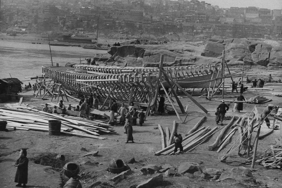 1946年,重庆长江江边的一处造船场,工人们正在手工建造大型川江木船,照片中央,