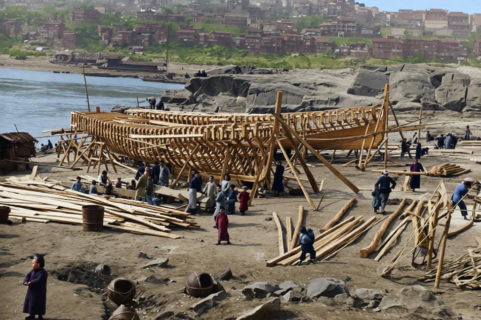 1946年,重庆长江江边的一处造船场,工人们正在手工建造大型川江木船,照片中央,两艘大型木船骨架已基本成型,船体用粗大木材搭建龙骨和肋骨,呈对称鱼骨状结构,高高架在木支架上,便于工人从下方和侧面施工。 船长约20-30米,属于典型的川江尖底平头货船设计。数十名工人散布现场,有的在锯木、刨板、钉榫,有的搬运木材、绑扎支架,工具简陋,全靠手工和经验。地面堆满木料、木屑,江边可见其他船只和对岸密密麻麻的重庆老城区房屋(吊脚楼风格),山城地形清晰 1946年抗日战争刚结束,重庆作为大后方,川江航运急需恢复,上游物资、粮食、盐煤运输全靠木船,三峡滩险要求船体坚固灵活,故传统造船业迅速复苏。重庆江边分布众多家庭式或作坊式船厂,工匠多为世代相传的“船老大”或木匠,采用榫卯结构、不用一钉。