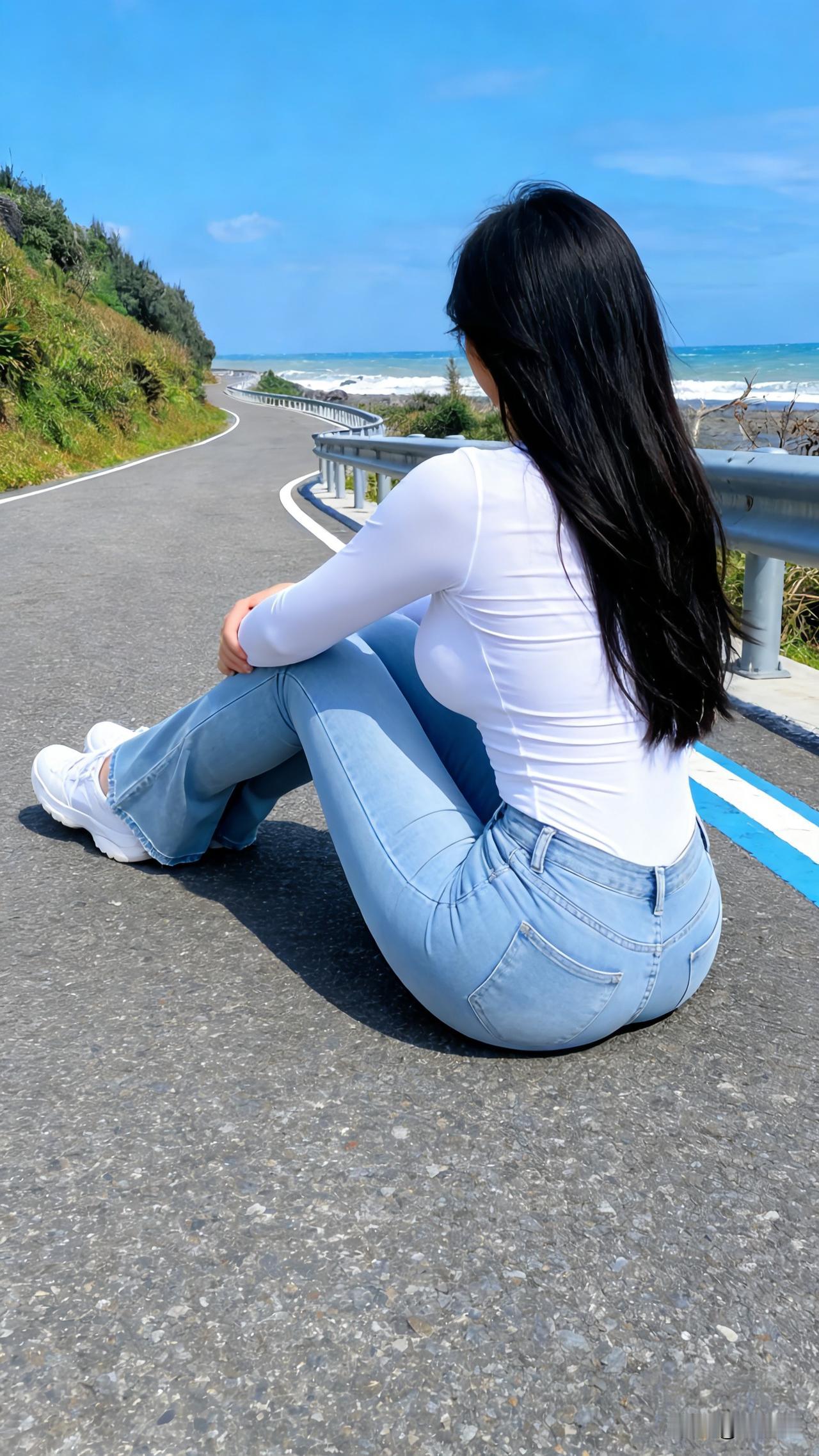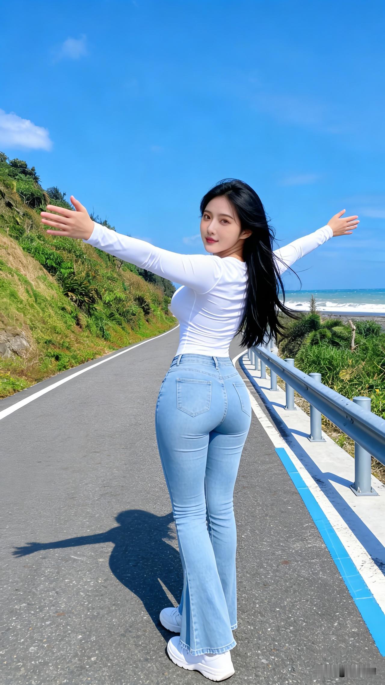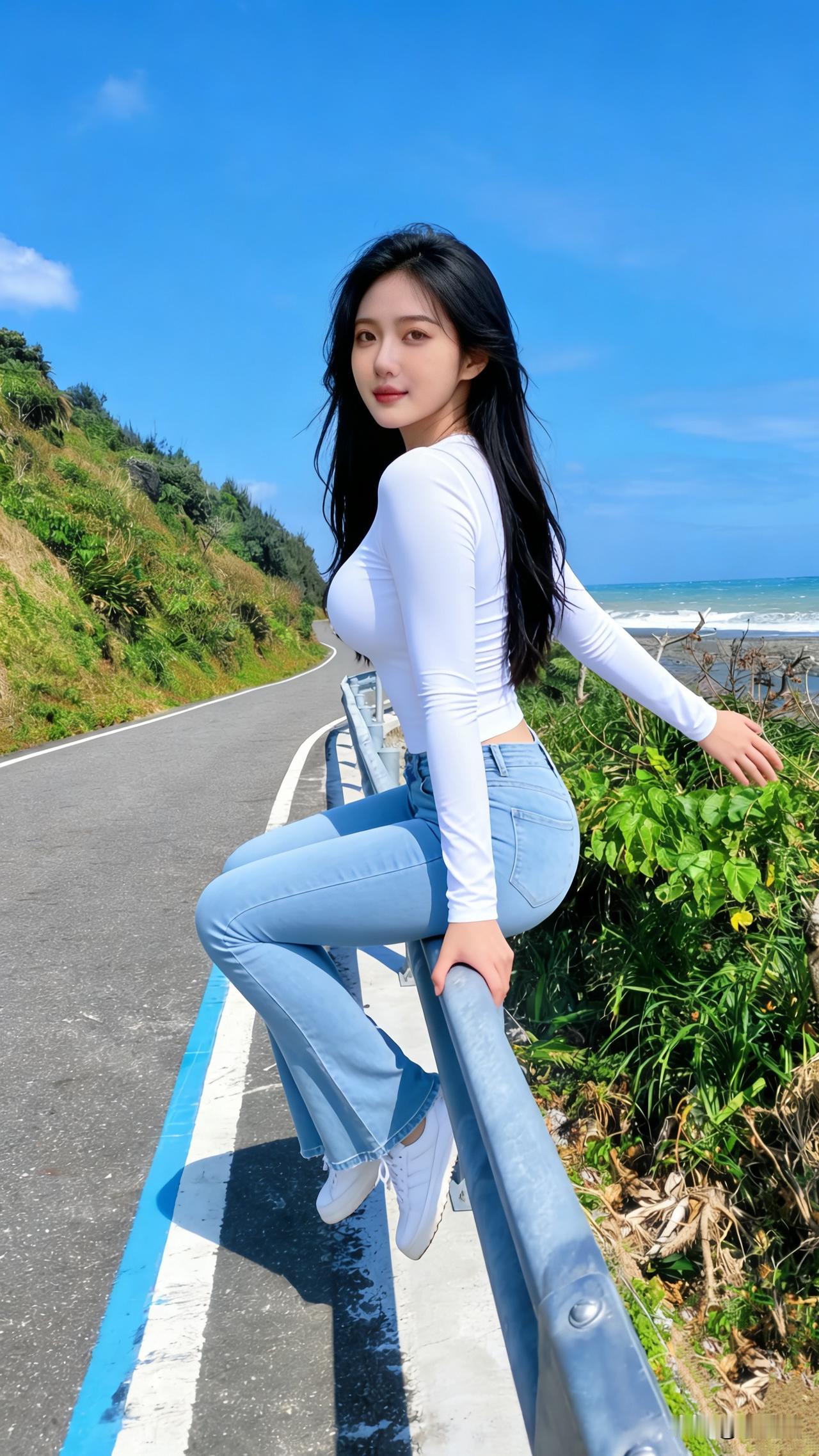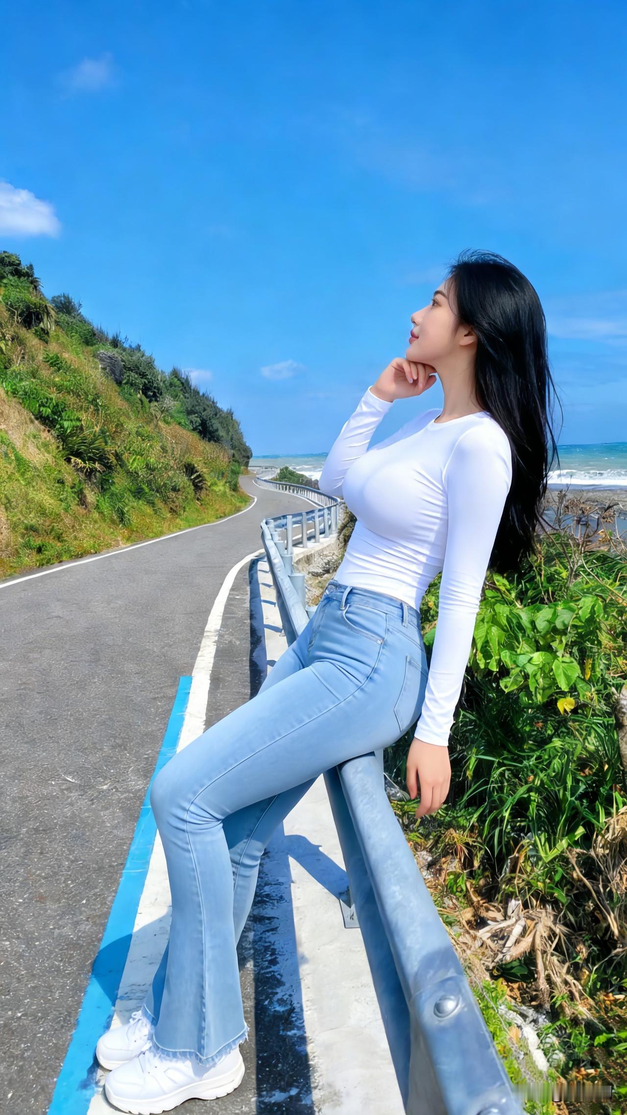 海边公路上的清新穿搭,白色上衣+牛仔裤,清纯甜美!🌊👗👖