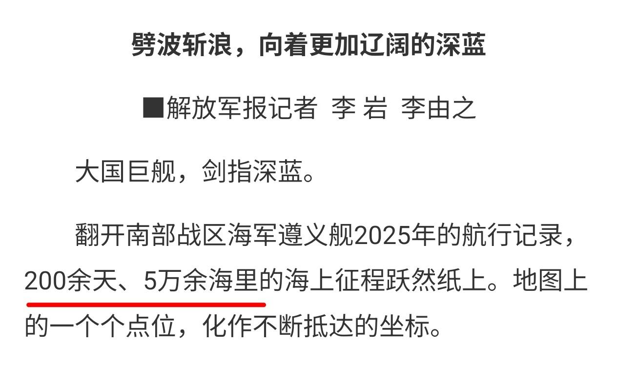 2025年,海军055级大型驱逐舰遵义号,一年出海200余天,航程超过五万余海里。这要是搁在八十年代,这是遵义舰一年把051旅大级一辈子的里程走完了,可见现在海军的训练强度和海外力量部署范围已经有了飞跃式的进步。