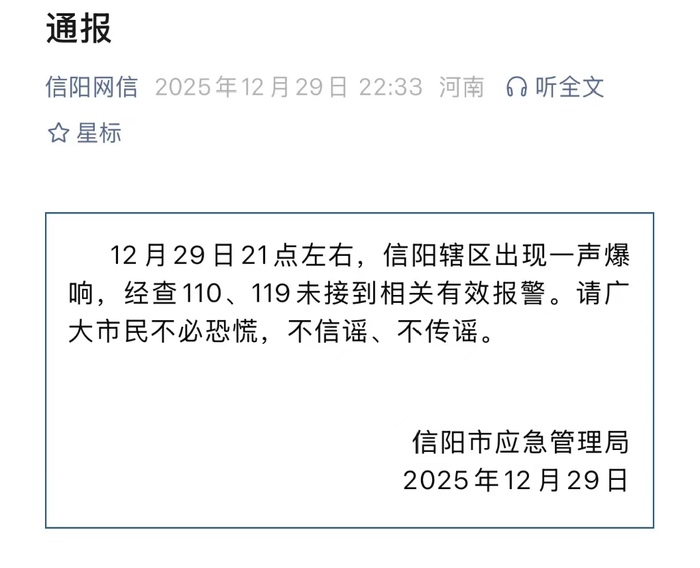 12月29日21时左右,河南信阳市辖区多地上空突发一声巨响,伴随疑似冲击波的震动,引发市民广泛关注。当晚,信阳市应急管理局迅速发布通报称,明确未接到相关有效报警,提醒市民不必恐慌,不信谣、不传谣。新黄河记者注意到,事件发生后,“信阳巨响”相关话题迅速在网络发酵并登上热搜。30日,新黄河记者致电信阳市应急管理局,该局工作人员表示:“我们能确定不是突发事件和安全事故。”