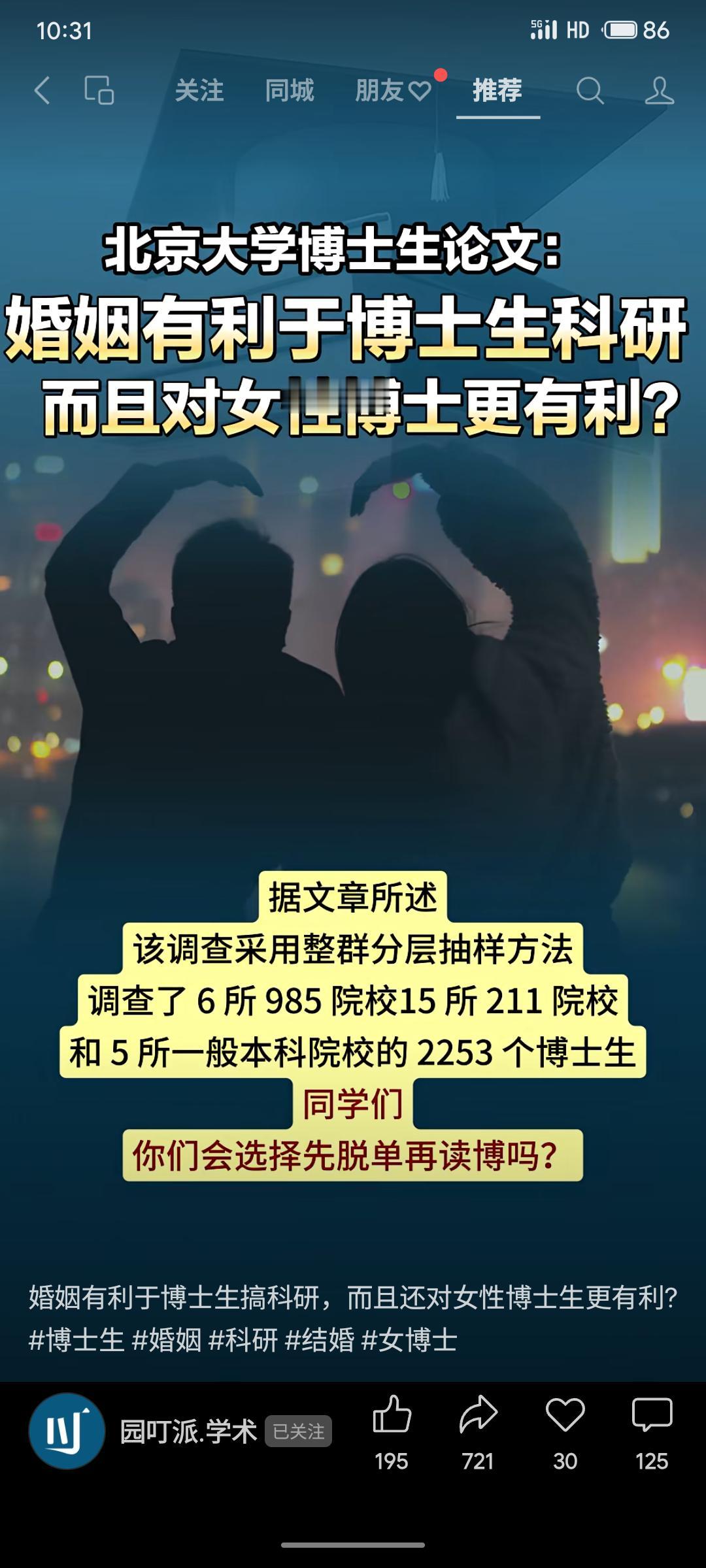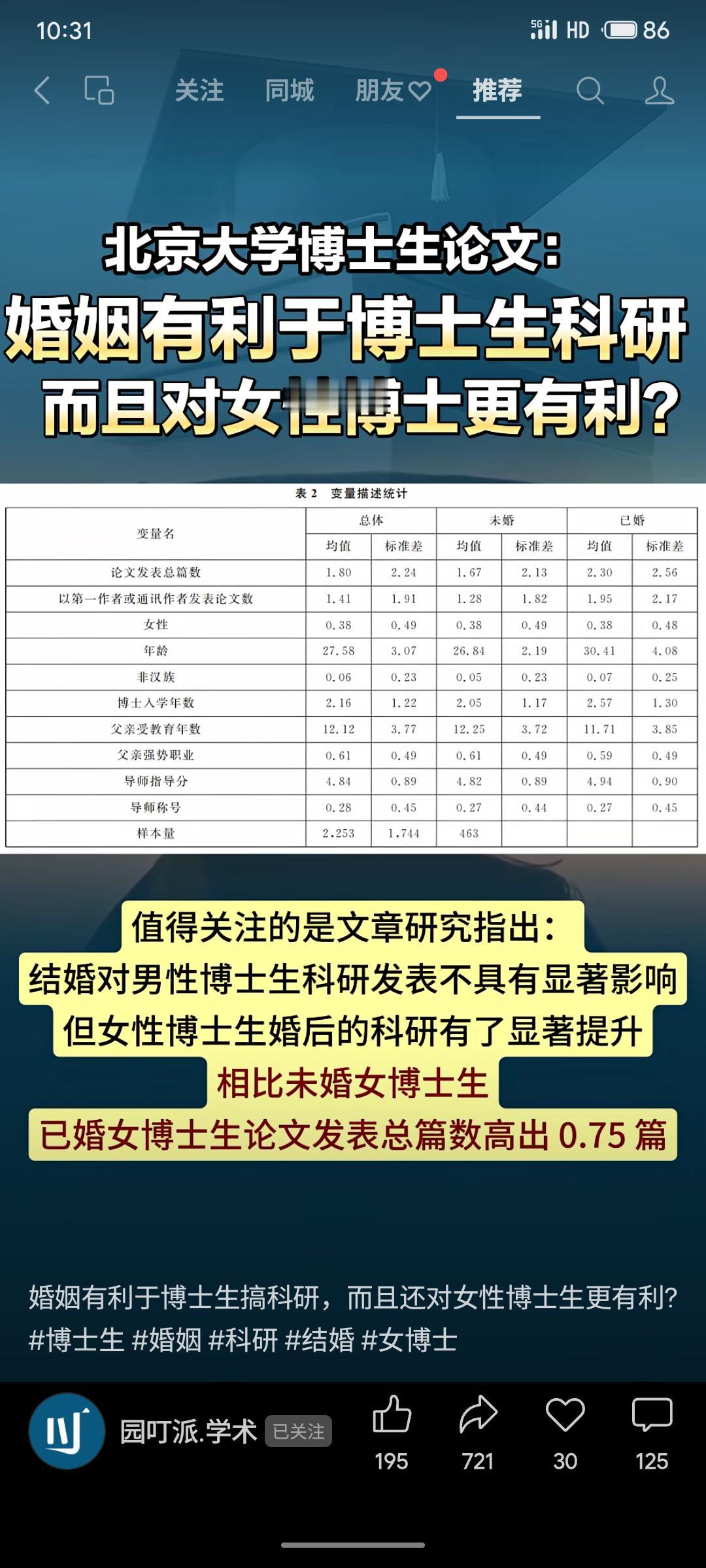 一项基于2016年首都高校博士生调查数据的研究发现,婚姻对博士生科研发表有显著正向影响。已婚博士生整体论文发表数比未婚生多0.4篇,其中女性博士生更显著,比未婚女博士生多发表0.75篇,而男性则无显著差异。研究认为婚姻带来的支持可能有助于科研产出。