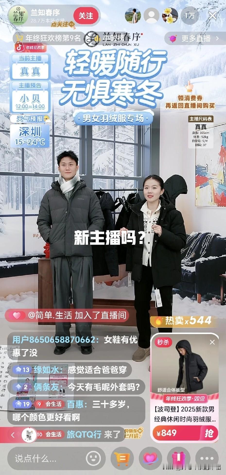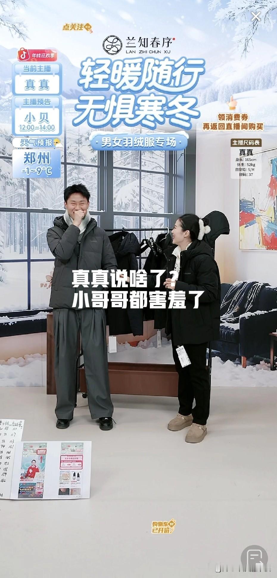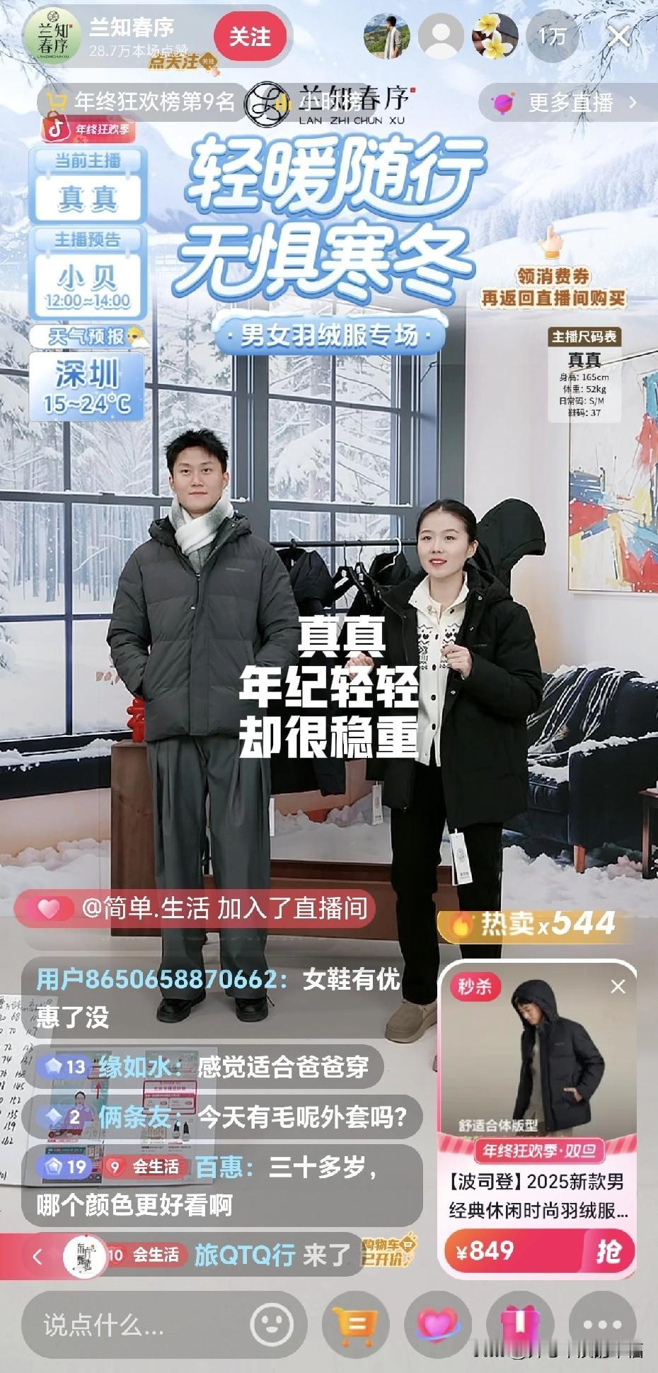 真真一点也不像新主播,真真的形象气质很符合主播的要求,就算第一次直播大家并没觉得这个女孩不适合直播,真的一点也不违和。 现在兰知春序虽然不如与辉同行人气高,但带货成绩却非常亮眼,因为质量放心。 今天走进兰知春序,主要是今年妈妈80大寿,想着给老爸买件羽绒服,正好看到了真真在讲解,主打信任走进了直播间,价格有点小贵,但是孝心要趁早,老人就像老小孩,更要哄得开开心心!