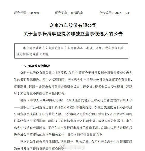 众泰汽车今日发布公告称,公司董事长李立忠因个人家庭原因申请辞去董事长、董事职务。同时,李立忠辞去董事会战略委员会主任委员、提名委员会委员职务。 众泰汽车表示,李立忠的辞职不影响公司董事会正常运行和公司日常经营。公司将尽快完成董事长选举等相关工作,并及时履行信息披露义务。(新浪科技)