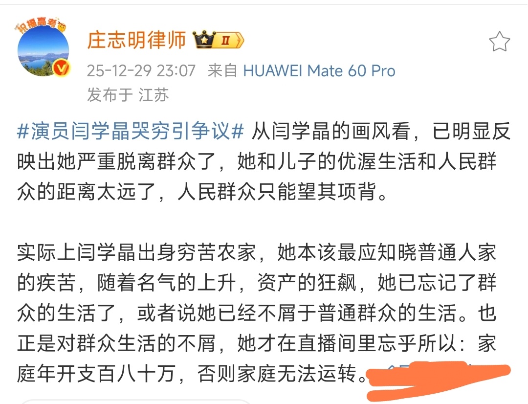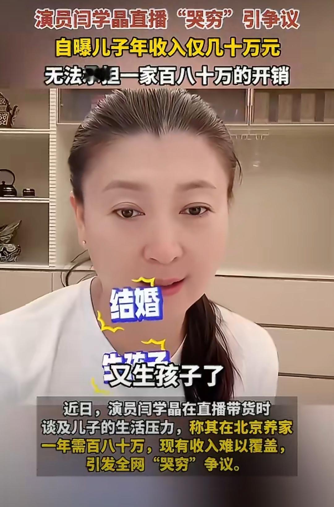 闫学晶直播哭穷这个事,其实也好理解。闫学晶直播说儿子在北京几十万不够花,听着挺离谱,但你要是了解她的生活,可能就不这么想了。演了一辈子农村剧,从《刘老根》里的山杏到各种底层女性角色,她把“接地气”刻进了骨子里。可现实中,她的生活早就和普通家庭不是一个频道了。在北京住着170多平的大平层,三亚还有房,看着风光,但物业费、装修维护这些钱,可不是小数目。一条广告报价12万,直播带货收入更是没边,但北京的生活成本摆在那儿啊!普通家庭一年20多万就够了,她儿子一年几十万,在北京也就刚够温饱,还得养孩子、教育、医疗,哪哪都要钱。吃的有好的,用的有好的,干活还不能太累,赚钱还不能太少。想维持这样的条件,一年可不得千八百万的。我记得看过一个报道,有钱人家里光电费一个月都好几万。甚至有些国外明星家里水龙头都不关。就这么过日子,你不花钱谁花钱呢?