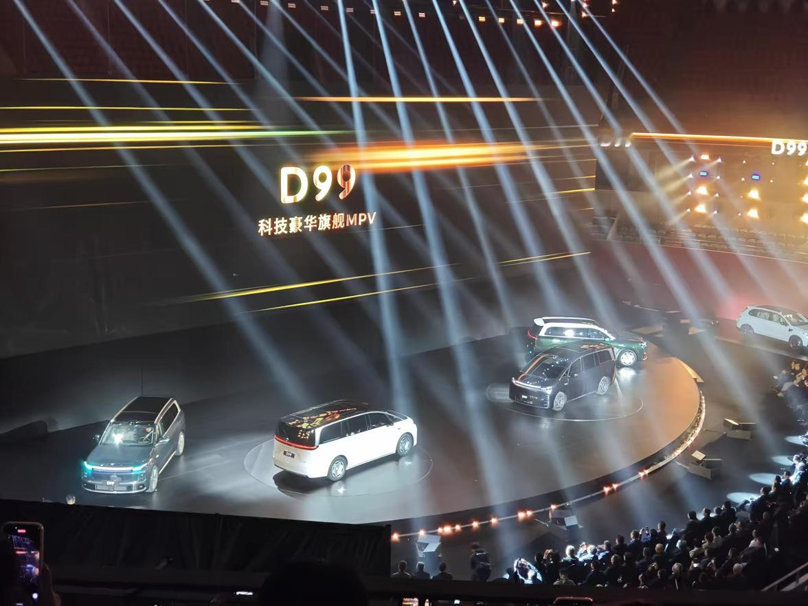 新出的两款车是重点。D19这辆SUV,内饰看着确实不错,空间利用花了不少心思。另一款MPV车型D99是首次亮相,外形很流畅,听说增程版电池很大,续航应该挺靠谱的。