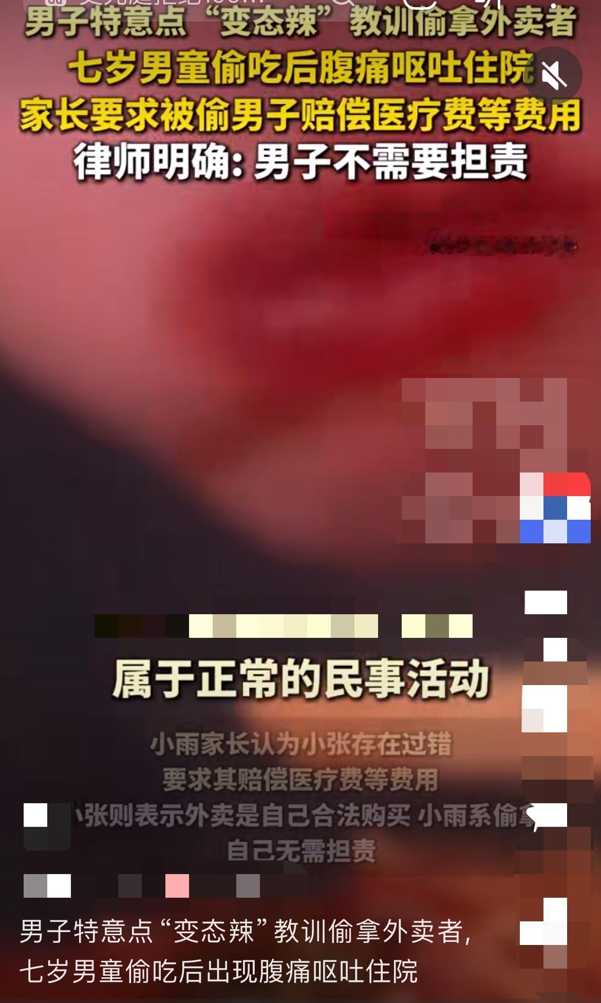 “你点的外卖把我家孩子辣进医院了,这钱你必须赔!” 在北京某小区,一位家长因为自己7岁的孩子偷吃了邻居点的“变态辣”外卖后住院,理直气壮地找上了门索赔。而被索赔的邻居小张更是憋了一肚子火,他的外卖已经不是第一次被偷了,这次特意点超辣口味,就是想治治这偷外卖的毛病。 这事儿说起来也简单。小张因为外卖多次丢失,心里又气又无奈,为了教训一下偷拿者,他这次特意点了一份“变态辣”口味的外卖。那天下午,7岁的男孩小雨在小区玩耍,看到小张家门口放着一份没拆的外卖,周围没人看管,就偷偷拿走并吃掉了。结果没多久,孩子就出现了剧烈腹痛、呕吐的症状,被紧急送医,诊断为急性肠胃炎,住院治疗花了两千多块钱。 孩子遭了罪,家长心疼又生气,但他们找上的不是自己疏于监管的责任,而是点了这份外卖的邻居小张。小雨家长认为,小张存在过错,应该赔偿医疗费等损失。小张则坚决拒绝,他的理由很直接:外卖是自己合法购买的财产,孩子是偷拿行为在先,自己没有任何责任。 事情在网络上曝光后,瞬间炸开了锅。网友们讨论的焦点很集中:孩子偷东西固然不对,但故意点“变态辣”外卖等着小偷上钩,这算不算设局?责任到底该怎么分? 这场因辣而起的风波,您觉得问题的根到底在哪?是家长的教育疏忽,是邻里之间的信任缺失,还是其他什么呢? 请大家就事论事,分享看法时保持客观冷静。 [免责声明]文章的时间、过程、图片均来自于网络,文章旨在传播正能量,均无低俗等不良引导,请观众理性看待本事件,切勿留下主观臆断的恶意评论,互联网不是法外之地。本文如若真实性存在争议、事件版权或图片侵权问题,请及时联系作者,我们将予以删除。