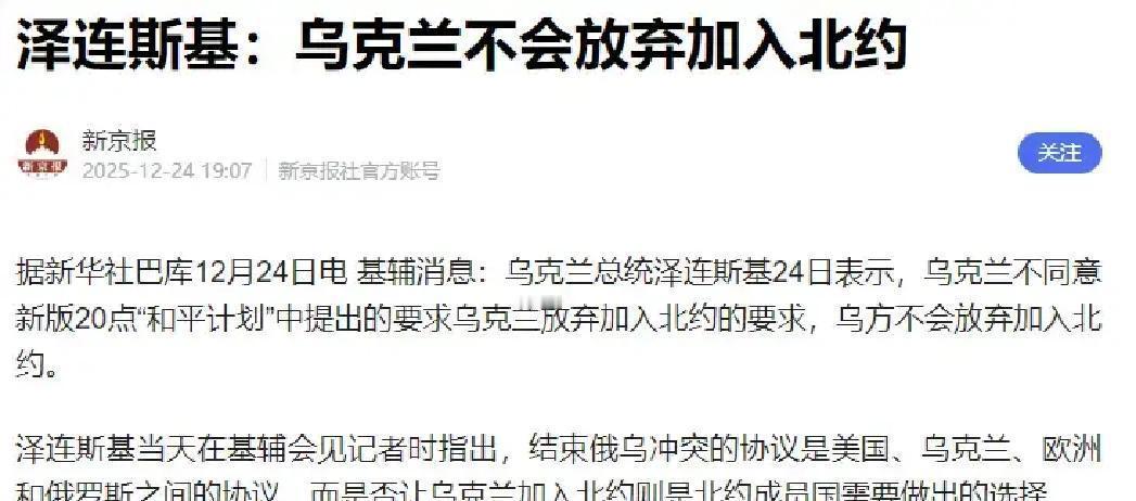 12月24日,乌克兰总统泽连斯基在基辅向全世界扔出了一颗重磅炸弹,他公开宣布:乌克兰不同意新版20点“和平计划”中要求乌方放弃加入北约的条款,乌克兰绝不会放弃加入北约。 12月24日在基辅,泽连斯基当面表示乌克兰不会接受新版20点和平计划里“放弃入约”的要求,结果就是乌方把加入北约的目标再次明确提上台面;这份草案是乌美多轮商谈从最初28点精简来的,俄方一直坚持让乌克兰保持中立、把军队规模降下来,美、乌、欧、俄都在其中掺和,俄方发言人佩斯科夫也说不适合公开讨论细节,但美方很清楚俄方的底线。 接下来乌克兰这边最直接的变化,是国内支持入约的人会觉得政府更硬气,内部压力暂时缓一缓,但对外谈判更难推进,跟俄方的话头会更卡壳;美方和部分欧洲国家本来就不赞成把“入约”当成安全保障的核心,现在乌方语气转硬,短期内可能能给自己多点说话分量,但也可能让来自西方的承诺更谨慎,时间拖得更久,资源到位也更慢。 另一方面,俄方核心诉求被顶回去,场面只会更冷,边境和前线的紧张度不容易降;北约和欧洲要继续权衡怎么帮乌克兰、怎么避免把事态越推越高,做决定会更谨慎;对普通人来说,谈不拢就意味着冲突不容易收尾,家里人的安全担心更久一些,工作和生活安排更容易被打断,物价和开销的压力不见得立刻缓下来,出行、办事、拿到援助和重建的具体支持都可能继续往后拖。 有网友说:“十天前说可以放弃入约,十天后又不放弃,普通人只想尽快停火,别再拖了。”另一个网友则表示:“站稳入约的态度能换来更清晰的安全承诺,但也要把握节奏,别把谈判彻底搞死。” 说白了,就是乌方把国家安全的目标定死在入约上。归根结底,这是把安全感的选择交给北约成员国,而不是把它全部捆在这次停火安排里。长远来看,这会让停火和重建的时间表更不确定,也会让乌方在外部支持上更看重确切的承诺。最让人唏嘘的是,十天之间的来回,让外界对乌方说话的稳定性打了问号,谈桌上的信任度更难攒。 我看这事的关键在于,乌克兰要的是长久的安全,但把话说得太硬,会让谈判更难推进,最后可能谁都不满意。当务之急是把能落到实处的安全安排先谈稳,把老百姓的日子先安下来,再去谈更长远的入约问题。 您怎么看这件事?
