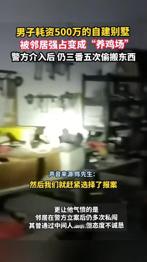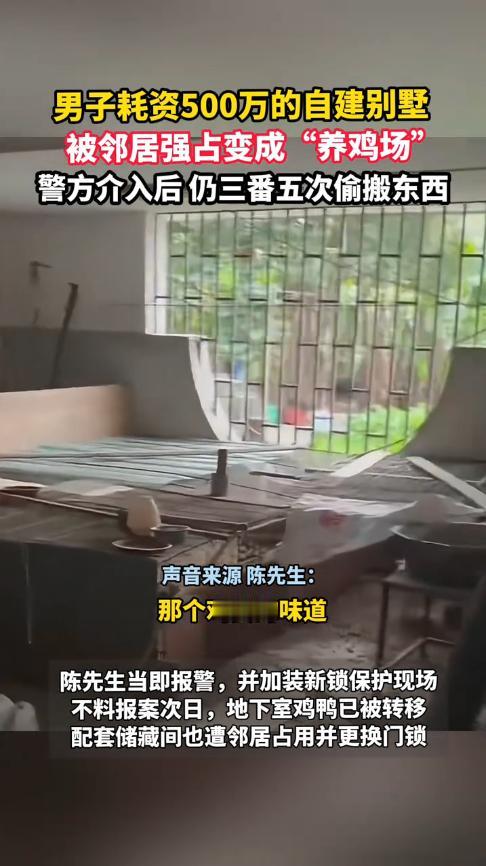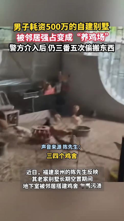“严查到底!”12月21日,福建泉州,一男子常年在外地经商,价值500万的别墅一直闲置着,这次祭祖时回了一趟家,进门后却闻到刺鼻的臭味,之后又在地下室找到了四五十只鸡鸭,显然是被人霸占了!网友:再不回来就有人住了。 很多人为了更好地发展,会来到外地工作,只留老一辈在老家居住,等到老人去世后,这些房子大概率就闲置下来了。 陈先生就有相似的经历,他很多年前就来到外地经商,挣了钱后,就把老家原先的宅基地进行了翻修,斥资500万,修成了一栋大别墅! 不过,在老人去世后,这栋房子就一直没有人住了,陈先生只在祭祖的时候会回来一趟,有时候连家门都不进去就又离开了。 这次陈先生回老家祭祖,路过老房子时就进来看了看,结果推开门后,一股臭味扑面而来,呛得他喘不上来气,而且还能听到鸡叫声! 陈先生在家里探索着,最终在地下室里发现了数十只鸡鸭,储物室内摆放着各种工具,很明显是有人把这里当成了养鸡场。 陈先生立即报了警,可是在警方调查期间,那人竟将屋内的鸡鸭和工具全部搬走!最终经过调查,擅自进来的人是同村的一名村民,但是陈先生并不认识他,而且对方连句道歉的话都没有说。 网友看后表示,这难道不是入室盗窃吗,必须严惩这种人,让他们知道触犯法律的后果是什么! 信息来源:《老家自建别墅地下室被村民改成鸡舍 业主发现后报警》大皖新闻