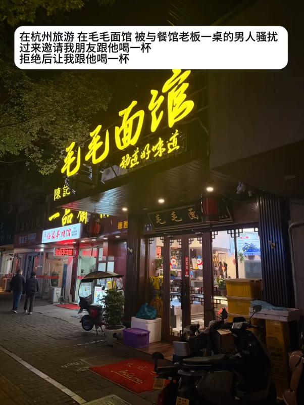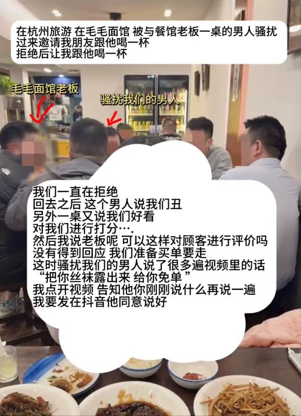 女子面馆吃面遭老板一桌骚扰“露丝袜免单”! 浙江杭州,两名女子特意慕名去网红毛毛面馆打卡,结果被老板同桌的朋友当众骚扰,先是逼女生喝酒,被拒后就恶意嘲讽女生长得丑,最后更是口出狂言 “把丝袜露出来就给你免单”! 女生当场找老板求助,老板居然全程沉默,一句话都不敢说!这可不是陌生客人闹事,那是你同桌吃饭的朋友啊!哪怕装模作样劝一句“别开玩笑”也好,可他就眼睁睁看着朋友性骚扰顾客,这不就是默认纵容?甚至让人怀疑,这俩是不是一路货色? 打着“网红打卡”的旗号圈钱,背地里却纵容朋友对顾客说这种低俗恶心的话,把女性当什么了?女生出门吃饭是为了开心,不是来听你这种恶臭言论的!