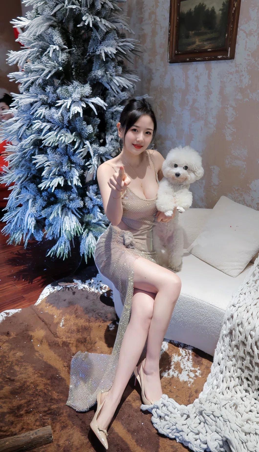 银霜圣诞树旁,鎏金礼裙揉着细碎的光泽,怀中小白狗添上软萌的甜意,节日的浪漫与温柔的灵动,在这一刻交织成独有的美好画卷。