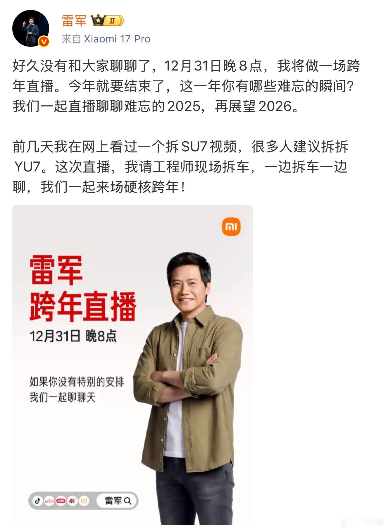 跨年夜蹲一场免费又硬核的汽车公开课!这场拆车直播,看点直接拉满。别人拆小米是看用料有没有,雷总拆是讲设计为什么,把工程师的专业术语,翻译成人人能懂的大白话。不回避质疑,不躲闪争议,就是要把产品掰开揉碎,摆在所有人面前。对比某些车企“禁止拆车”的操作,小米直接喊出“来,直播拆个够”,这反差感直接拉满。黑子们也别在评论区打口水仗了,直播间直接提问,现场拆车验证,是真知灼见还是无脑抹黑,一验便知。