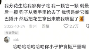我分花生给我家狗子吃, 我一颗它一颗, 剩最后一,颗 狗子从我手里抢去了我愣是给它嘴巴撬开, 然后把花生拿出来放我嘴里了