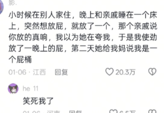 小时候在别人家住,晚上和亲戚睡在一个床上,突然想放屁,就放了一个,那个亲戚说你放的真响,我以为她在夸我,于是我使劲放了一晚上的屁
