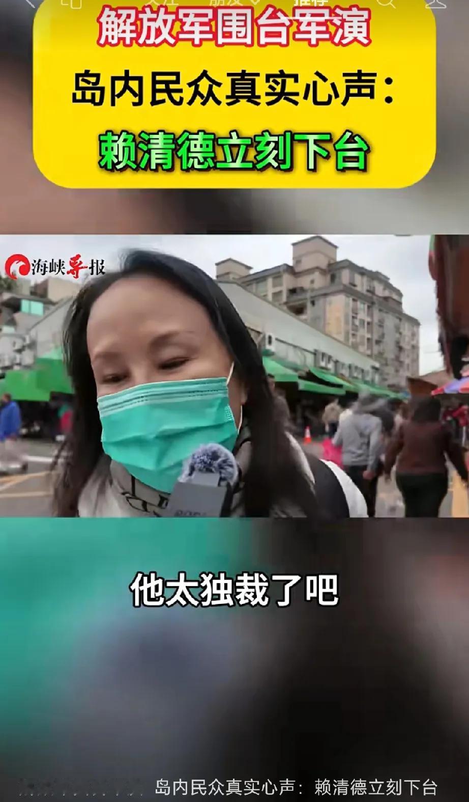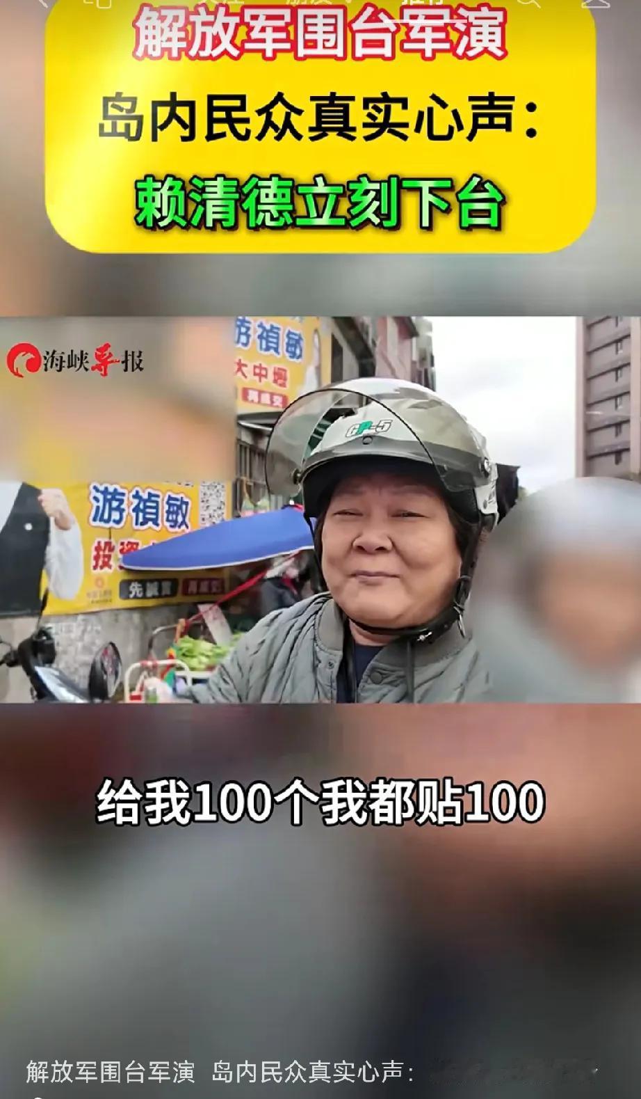 三句话讲明,赖清德治下的台湾人民有多恼火: 12月29日,台湾媒体现场采访台湾人民: 第一句,给我100个,我贴100,看到了解放军围岛。 第二句,赖清德太独裁,台湾政客贪污腐化,没有任何希望。 第三句,赖清德拿着台湾人民的血汗钱,去买美国的垃圾武器,掏空台湾。 人心向背,统一大业指日可待!
