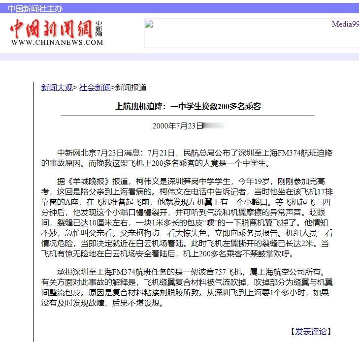 2000年,一中学生乘机去上海,坐在窗边的他,却发现机翼有个小豁口!更要命的是,飞机起飞后豁口慢慢裂开,突然,一大块铁皮竟然脱离机翼飞走了!   当时上海航空公司一架波音757客机准备从深圳飞往上海,飞机本该准时起飞,却因地面检修延误了一个多小时,直到12点29分才在闷热的天气中滑跑升空。   机舱内,乘客们大多放松下来,有人闭眼养神,有人调整座位准备小憩。   坐在靠窗位置的柯伟文却是例外,这是他第一次乘坐飞机,新奇感让他无法入睡,他把注意力转向窗外,仔细眺望那片银色的机翼。   起初,一切看起来正常,但很快,柯伟文注意到左侧机翼上有一个细小裂口,那裂口起先只有几厘米,却在高速气流的冲击下迅速扩大。   他盯着看,只见裂口边缘开始卷曲,内部结构隐约暴露,没过多久,一块超过1米长的蒙皮在强大气流作用下完全脱离,伴随异响消失在机尾后方。   裸露的部分开始摇晃,线路和框架在风中扭曲。这不是普通的颠簸,而是机翼结构严重受损的迹象。   柯伟文立刻意识到问题的严重性,他没有慌张,而是迅速将情况报告给机组人员,飞行员接到通报后,保持冷静,与地面塔台紧急沟通。   考虑到继续飞往上海的风险极大,机长果断决定改飞最近的广州白云机场,同时降低高度和速度,以减轻机翼负担,最终,飞机于13时05分安全迫降,所有乘客和机组成员无一伤亡。   事后检查显示,机翼左侧豁口已扩展到2米以上。那块脱落的蒙皮其实是缝翼与主翼之间的整流包皮,材质为复合材料。   专家调查结论明确:事故根源在于复合材料粘接剂脱胶,导致包皮在飞行中无法承受气动载荷而剥离。   如果裂口继续扩大,可能损伤内部油路、液压系统或电路,甚至引发失控或爆炸,后果不堪设想。   上海航空公司随后对同型号飞机进行全面排查,制造商也承认生产环节的责任,并召回部分批次进行加固维修。   机翼蒙皮并非简单的“铁皮”,它是飞机气动外形的关键组成部分,与骨架共同形成承受升力和扭矩的封闭结构。   现代客机越来越多采用复合材料,以减轻重量提升效率,但粘接工艺一旦出现缺陷,在高空高速环境下就会放大隐患。   这起事件暴露了当时航空制造和维护中的潜在漏洞:复合材料虽先进,却对胶合质量极为敏感,任何微小脱胶都可能在气流撕扯下演变为灾难。   柯伟文的发现,不仅挽救了全机生命,还推动了行业对复合材料粘接标准的反思,类似隐患在其他机型上也曾引发关注,但这次及时干预避免了更大悲剧。   它提醒我们,航空安全从来不是单一环节的责任,而是从设计、生产、检修到飞行全链条的严谨把控,更重要的是,乘客的观察和报告也能成为安全网的最后一环。   如今25年过去,航空技术已大幅进步,复合材料应用更成熟,检测手段更先进,但安全永远没有终点。 信息来源:中新网 上航班机迫降:一中学生挽救200多名乘客
