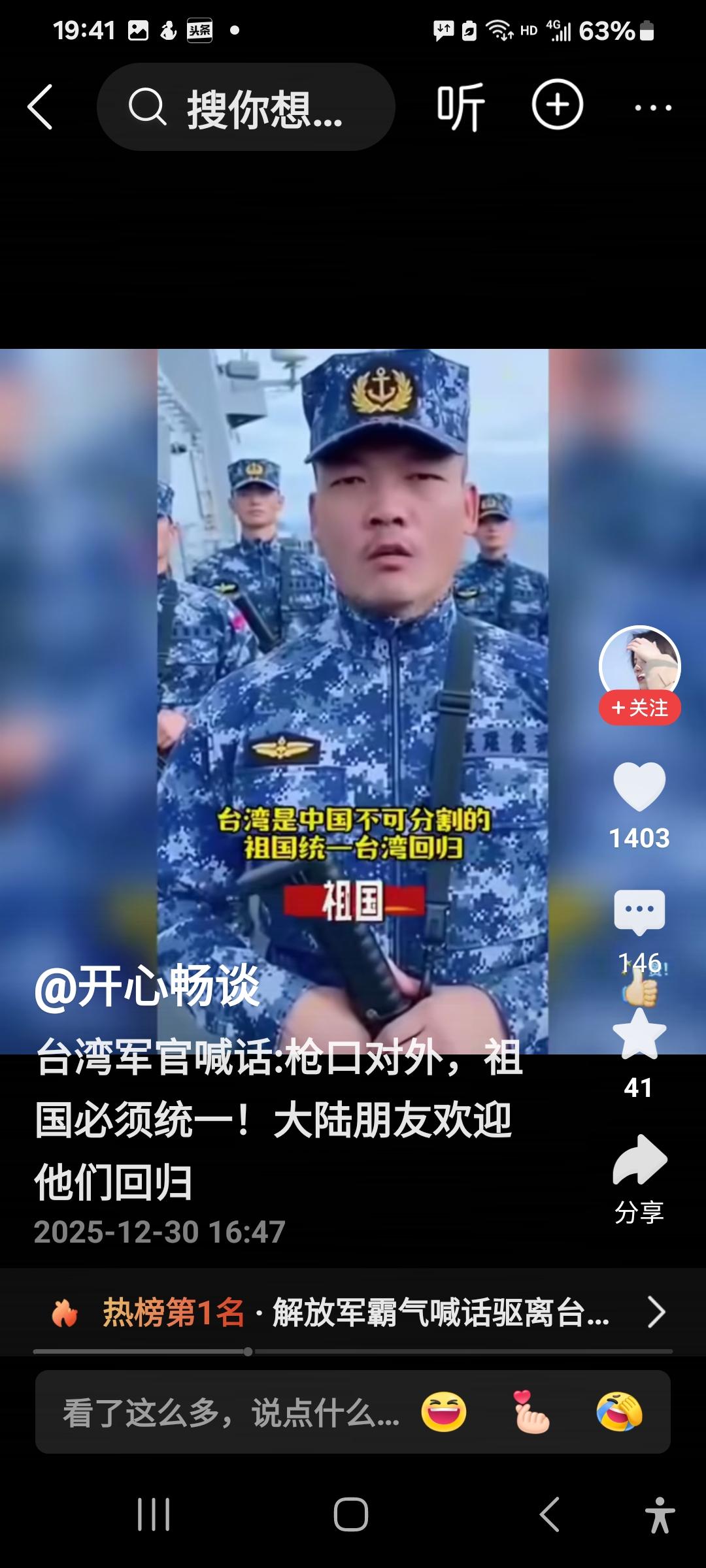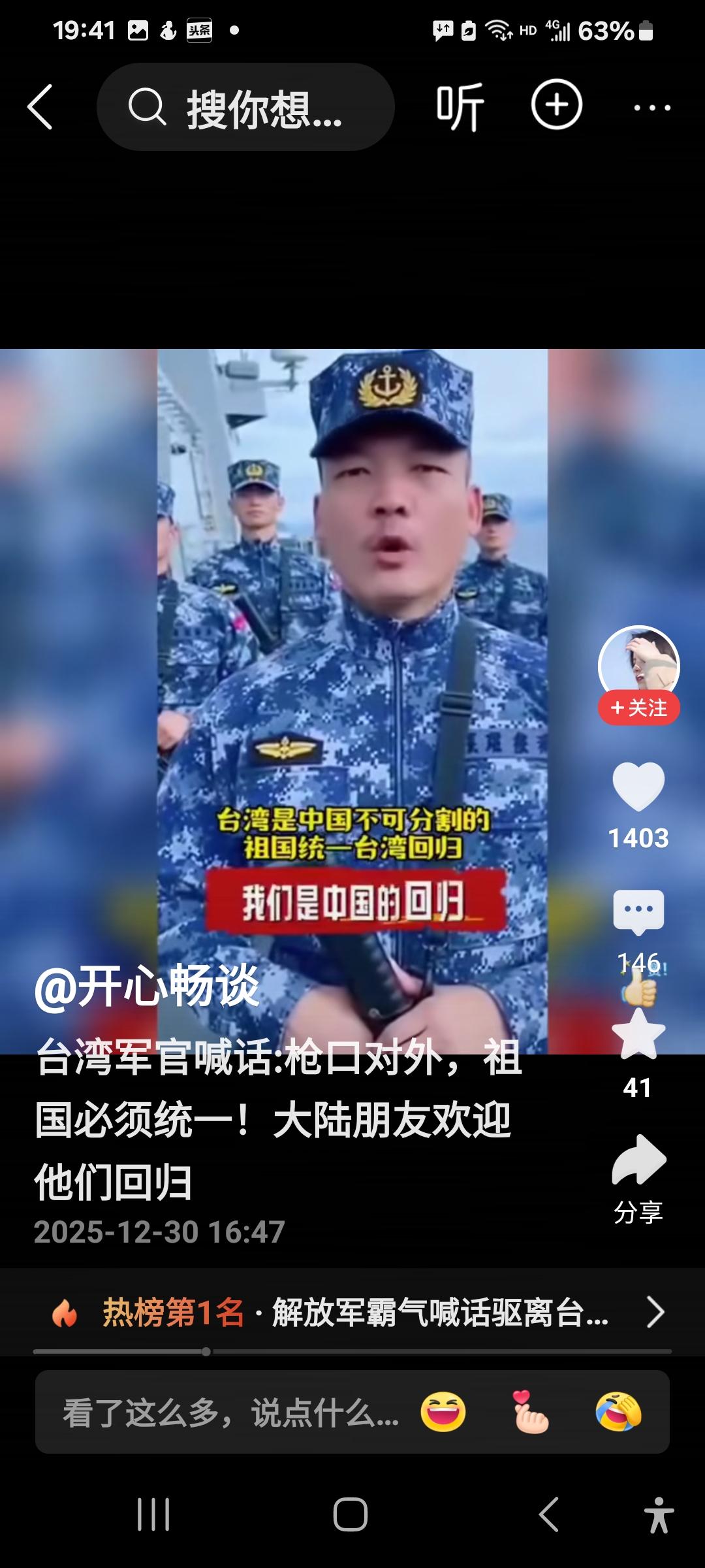 台军军官发声:枪口对外,祖国必须统一![赞][碰拳] 刷到这个视频时,被这名台军军官的话深深感动了。他说,台湾是祖国(中国)不可分割的一部分,枪口对外,祖国必须统一,必须回归,大陆的朋友们,你们欢迎我们吗?[赞][赞] 我们相信,大陆人民会热烈欢迎你们,你们懂得民族大义,十分光荣,大陆人民已经等你们很久很久了,欢迎你们起义投诚,投向祖国博大而温暖的怀抱,祖国统一的军功章有你们一半,你们回归祖国,功德无量,祖国欢迎你们,热烈欢迎你们回归![比心][比心][比心][碰拳]