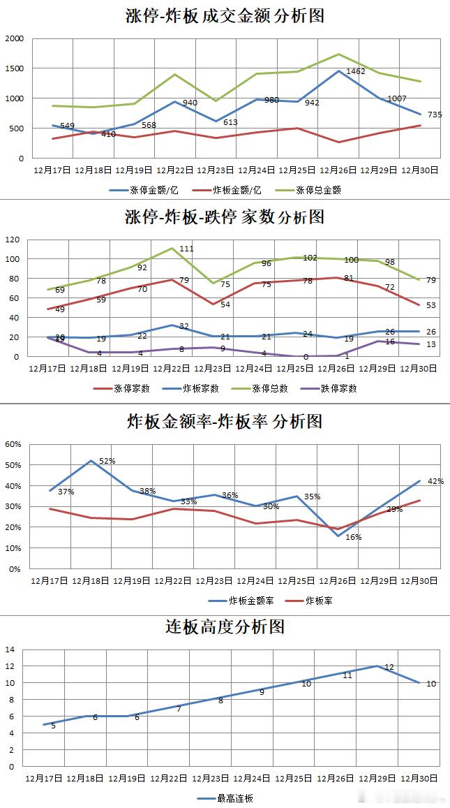 【12.30星期二】 湖南人涨停复盘 "涨停金额:735亿 炸板金额:543亿首板金额:558亿 连板金额:177亿涨停53家 炸板26家 跌停13家首板35家 连板18家" 【市场连板股】18只 177亿 代码 名称 末次时间 连板数 原因002969 嘉美包装 9:25 10 公告603278 大业股份 9:46 5 商业航天002931 锋龙股份 9:25 4 机器人002009 天奇股份 10:17 4 机器人002347 泰尔股份 11:29 4 商业航天002591 恒大高新 9:25 3 电池产业链605255 天普股份 9:31 2 其他001266 宏英智能 9:41 2 商业航天603458 勘设股份 9:49 2 商业航天603667 五洲新春 10:06 2 机器人000700 模塑科技 10:14 2 机器人605069 正和生态 10:23 2 人工智能605086 龙高股份 10:27 2 电池产业链603192 汇得科技 13:08 2 机器人688160 步科股份 13:19 2 机器人002177 御银股份 13:35 2 数字人民币600506 统一股份 13:46 2 统一002413 雷科防务 14:01 2 商业航天【机器人】19只 426亿 消息面:行业独角兽迎来上市潮 002931 锋龙股份 9:25 4/10天5板 优必选拟入主600682 南京新百 9:38 1 养老机器人002527 新时达 9:39 1 具身智能机器人+液冷603667 五洲新春 10:06 2 通过新剑供货T(传)000700 模塑科技 10:14 2 人形机器人002009 天奇股份 10:17 4 人形机器人(优必选)603608 天创时尚 10:17 1 机器人+女鞋603211 晋拓股份 10:41 1 越疆、智元机器人合作603626 科森科技 13:00 1/3天2板 TSL机器人000559 万向钱潮 13:01 1/4天2板 机器人603192 汇得科技 13:08 2 聚氨酯树脂(机器人皮肤)688160 步科股份 13:19 2 机器人002196 方正电机 13:24 1/4天2板 小鹏机器人002050 三花智控 13:26 1 人形机器人603009 北特科技 13:46 1 人形机器人(丝杠)600376 首开股份 14:29 1/4天2板 间接投资宇树300885 海昌新材 14:31 1 人形机器人603686 福龙马 14:34 1/3天2板 无人驾驶清扫机器人(福建)603119 浙江荣泰 14:52 1/4天2板 人形机器人(特斯拉)【商业航天】12只 149亿 消息面:商业火箭企业适用科创板第五套上市标准细化规则发布 603278 大业股份 9:46 5 商业航天002347 泰尔股份 11:29 4 商业航天001266 宏英智能 9:41 2 商业航天603458 勘设股份 9:49 2 北斗标准002413 雷科防务 14:01 2 星上智算600776 东方通信 9:59 1 卫星通信600192 长城电工 10:27 1 商业航天002342 巨力索具 11:01 1 商业航天603359 东珠生态 11:04 1 拟收购凯睿星通(卫星通信)002383 合众思壮 13:40 1 北斗导航GNSS600552 凯盛科技 13:43 1 商业航天001208 华菱线缆 14:12 1/4天2板 火箭线缆【大消费】3只 11亿 002905 金逸影视 10:35 1 影视影院605003 众望布艺 10:38 1 国潮000530 冰山冷热 10:45 1 冰雪运动【人工智能】4只 21亿 605069 正和生态 10:23 2/5天3板 智谱AI000665 湖北广电 9:40 1 智算中心(武汉)002757 南兴股份 9:48 1 AI智能体(微软)300840 酷特智能 10:34 1 AI智能体(服装)【公告】3只 13亿 002969 嘉美包装 9:25 10/18天11板 控制权变更(追觅科技)603722 阿科力 9:41 1 环烯烃共聚物000703 恒逸石化 14:49 1 国内最大的PTA生产企业【其他热点】 002591 恒大高新 9:25 3 钠离子电池605086 龙高股份 10:27 2 提锂技术605255 天普股份 9:31 2/4天3板 中昊芯英(TPU)002177 御银股份 13:35 2 数字人民币600271 航天信息 9:39 1 数字人民币603798 康普顿 10:46 1 数据中心液冷600506 统一股份 13:46 2 统一+液冷【其他个股】 000981 山子高科 10:01 1 哪吒汽车重整001299 美能能源 10:56 1 天然气605028 世茂能源 13:12 1 电力000411 英特集团 14:55 1 AI医疗300291 百纳千成 15:00 1/3天2板 拟并购【涨停炸板】26只 543亿 代码 名称 首次时间 涨跌幅 原因300503 昊志机电 13:27 18.59% 机器人300579 数字认证 10:02 17.46% 数字人民币300322 硕贝德 11:01 10.71% 液冷服务器300421 力星股份 13:32 10.58% 机器人603216 梦天家居 14:41 9.90% 大消费002471 中超控股 9:30 9.00% 商业航天601698 中国卫通 10:01 8.27% 商业航天603037 凯众股份 14:20 8.25% 机器人605167 利柏特 10:25 8.01% 核聚变002899 英派斯 14:26 7.74% 体育产业003041 真爱美家 9:30 7.07% AI应用002201 九鼎新材 11:25 6.51% 商业航天002083 孚日股份 10:50 6.36% 电池产业链600877 电科芯片 13:22 6.13% 国产芯片603221 爱丽家居 9:34 5.89% 消费002099 海翔药业 9:31 5.51% 医药603080 新疆火炬 14:03 5.15% 新疆概念600501 航天晨光 11:21 5.10% 商业航天603085 天成自控 9:56 5.09% 新能源汽车600728 佳都科技 9:25 5.00% AI应用003033 征和工业 14:02 4.48% 机器人600765 中航重机 9:53 4.01% 航天603123 翠微股份 9:30 2.18% 数字人民币002682 龙洲股份 9:32 -0.52% 福建600783 鲁信创投 9:25 -3.15% 商业航天002187 广百股份 9:25 -9.81% 消费