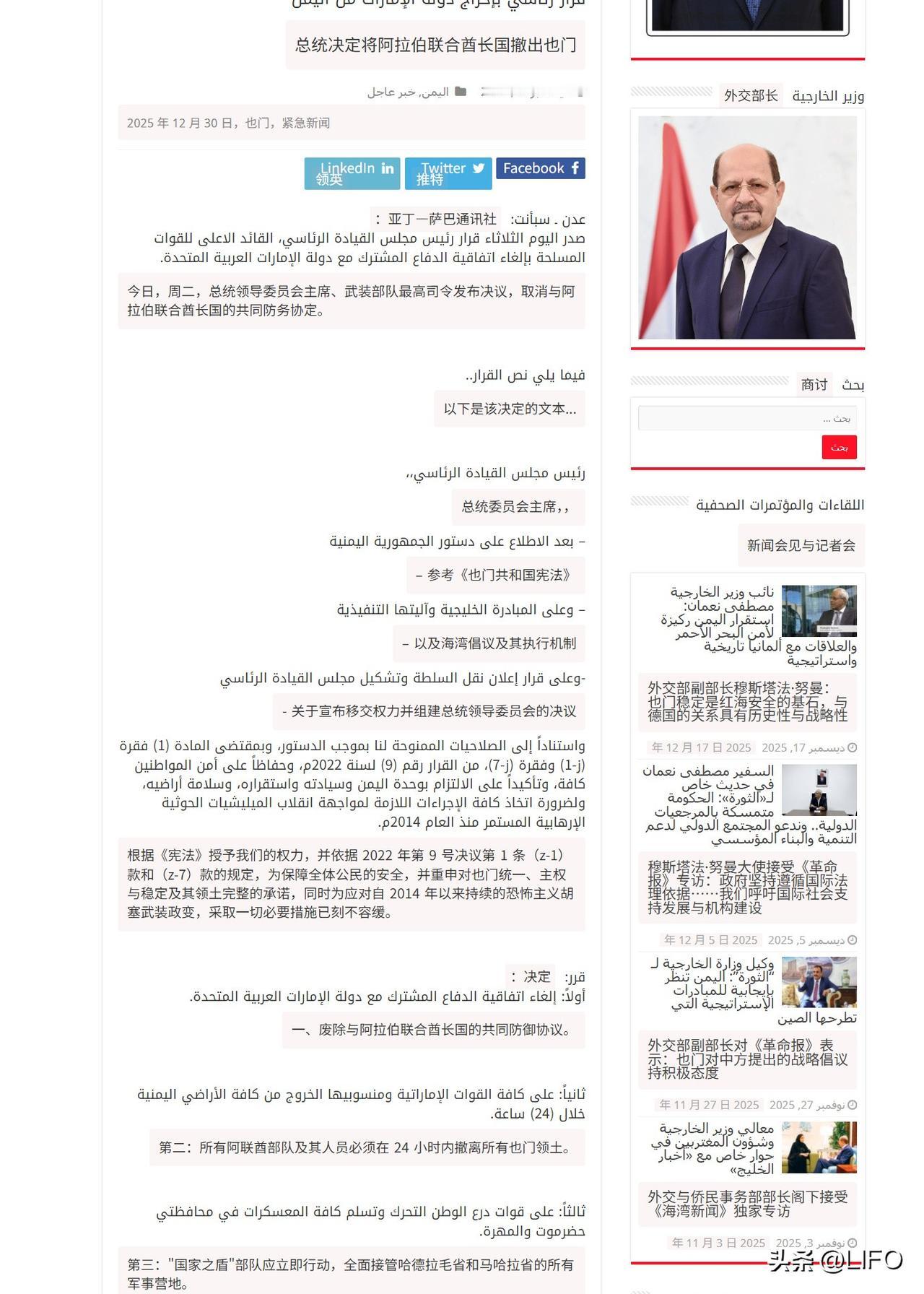 沙特支持的也门亚丁政府颁布总统令:宣布废除与阿拉伯联合酋长国的共同防御协议,所有阿联酋部队及其人员必须在 24 小时内撤离所有也门领土。来自亚丁—萨巴通讯社的报道。