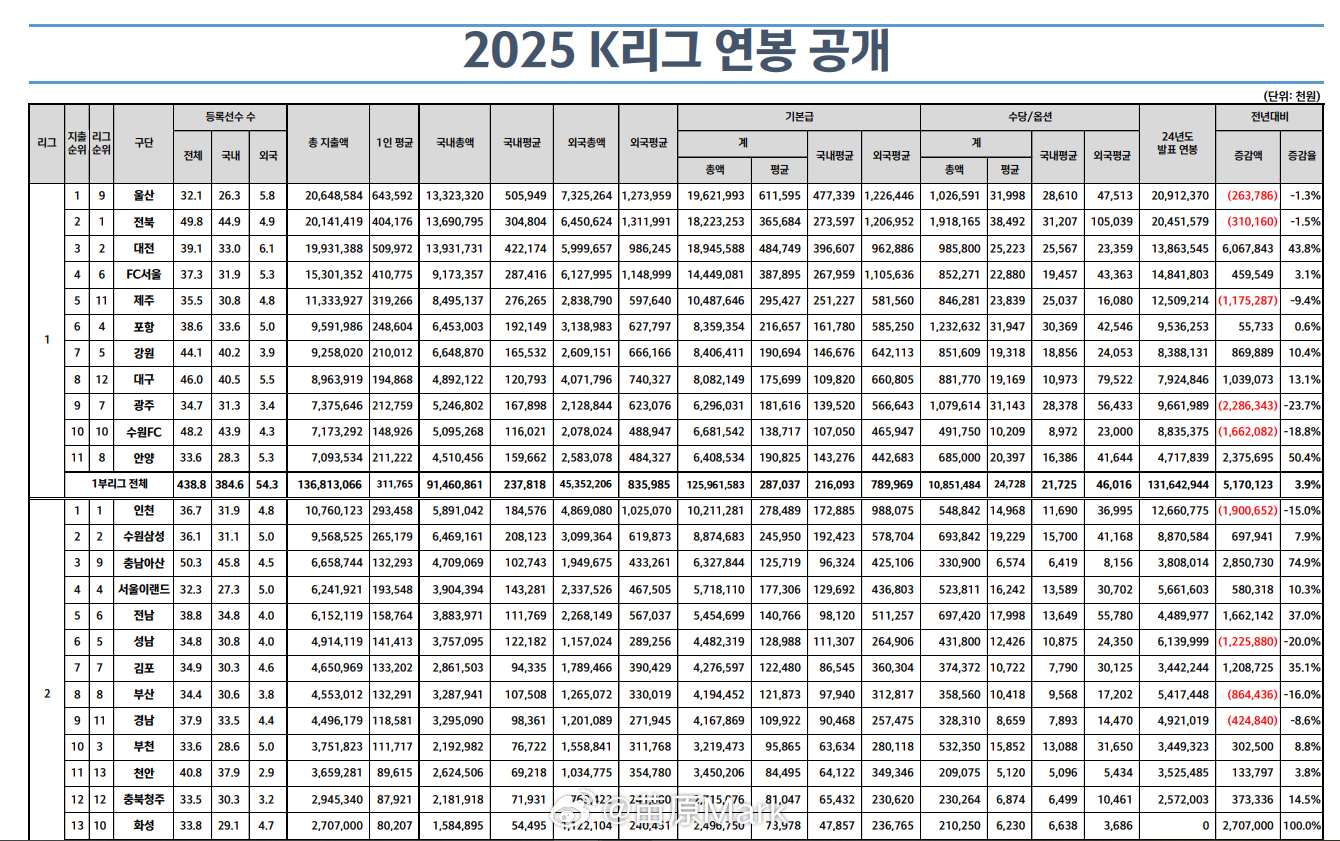 K联赛工资投入最大的还是蔚山9994万人民币,蔚山之后是全北9748万、大田9647万、首尔、济州、浦项、江原、大邱、光州,最少的是水原和安养。金泉不参与统计,K1球队平均工资年投入6019万人民币,K2平均2523万人民币。蔚山平均工资311万,大田平均247万,首尔平均199万。K1平均年薪151万人民币,本土球员年薪98.6万人民币,外援平均405万人民币,算成美元58万。K2平均年薪69万人民币,本土球员年薪52万人民币,外援平均200万人民币,算成美元29万。