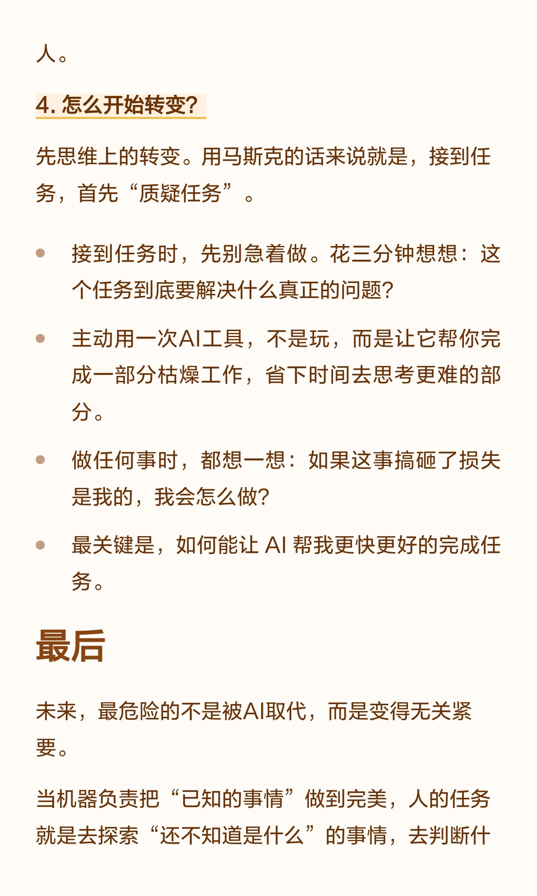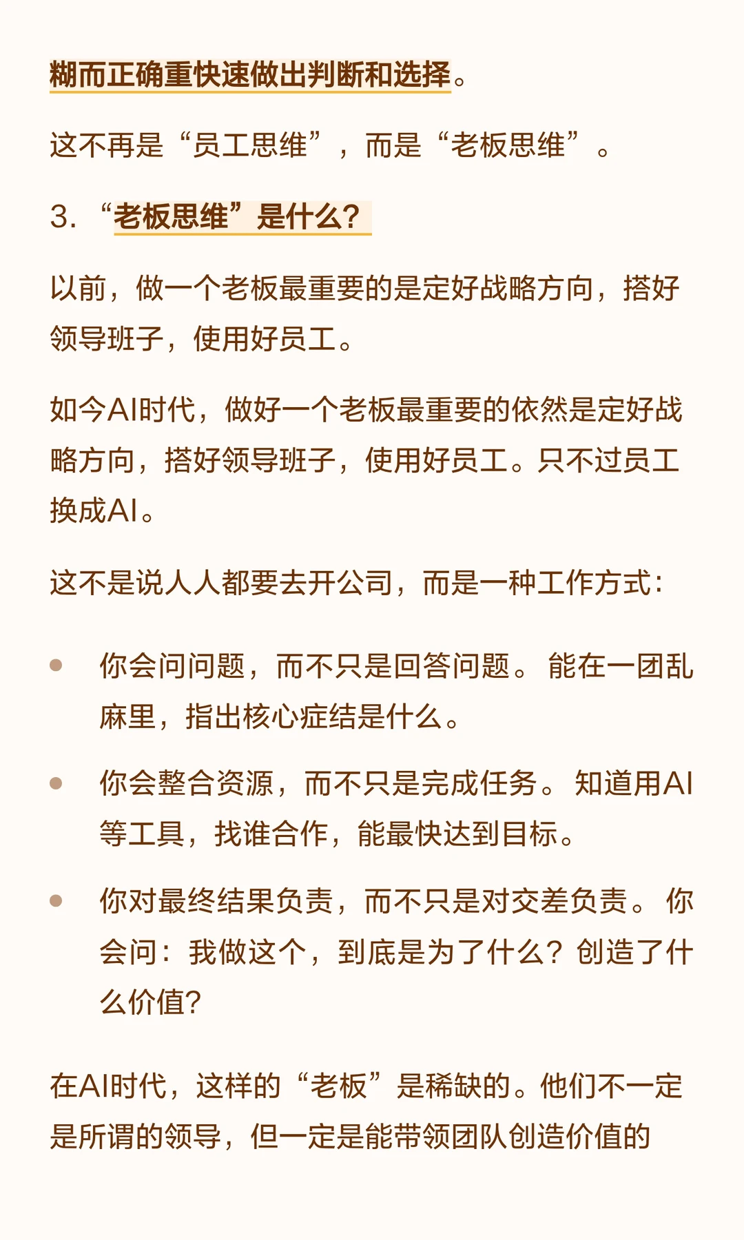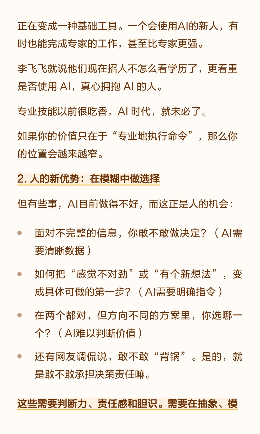 AI擅长专业任务,人需转型为“老板思维”,在模糊决策中发挥优势,整合资源,负责结果,探索未知,创造价值。