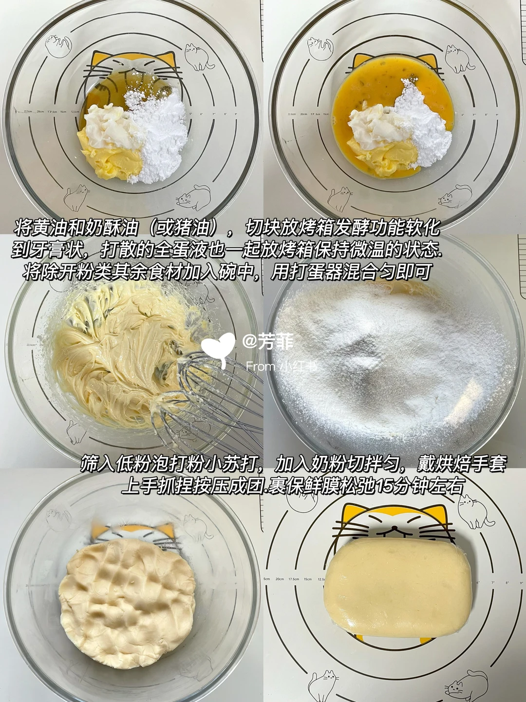 1️⃣准备好食材.将黄油和奶酥油(或猪油)切块,冬天放烤箱发酵功能软化到牙膏状,打散的全蛋液也一起放烤箱保持微温的状态.将除开粉类其余食材加入碗中,用打蛋器混合匀即可⚠️这里要注意全蛋液的温度,不能过低或过高.🔜如果掌握不好就先黄油猪油糖粉搅拌匀,再分次加蛋液混合