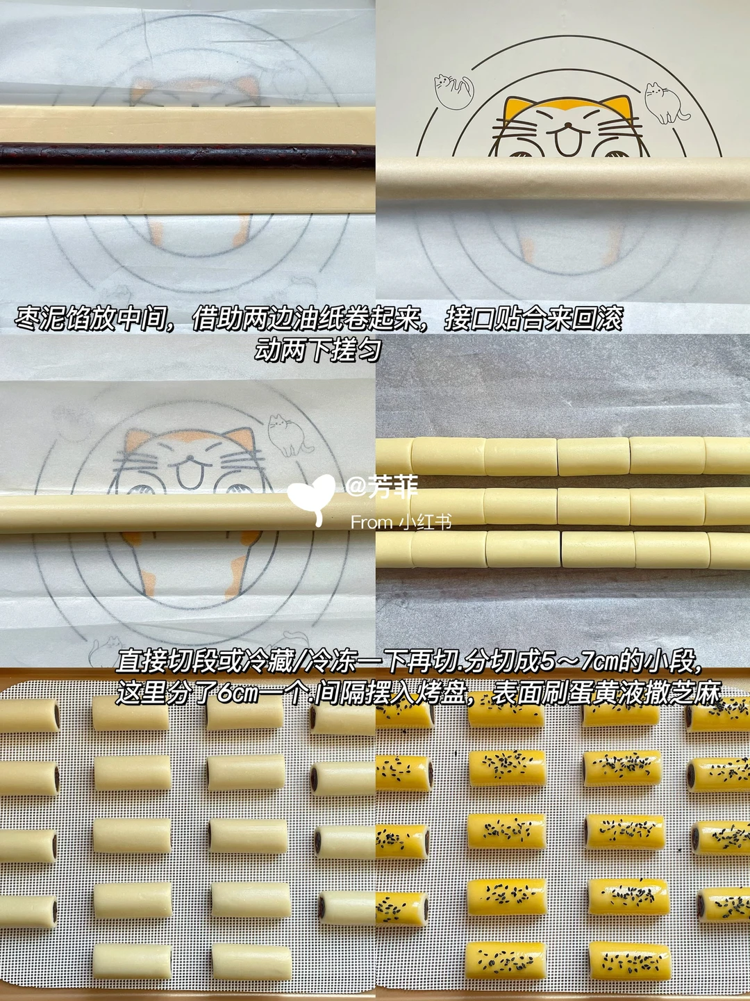 4️⃣枣泥馅放面片中间,借助两边油纸卷起来,接口贴合来回滚动两下搓匀,直接切段或冷藏/冷冻一下再切.分切成5~7㎝的小段,这里分了六段/6㎝一个.间隔摆入烤盘,表面刷蛋黄液撒芝麻