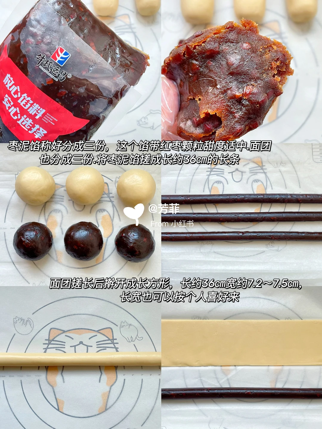 3️⃣ 枣泥馅称好分成三份,这个馅带红枣颗粒甜度适中,将枣泥馅搓成约36㎝的长条备用. 面团也分成三份,面团搓长后擀开成长方形,长约36㎝宽约7.2~7.5㎝⚠️长宽也可以按个人喜好来分
