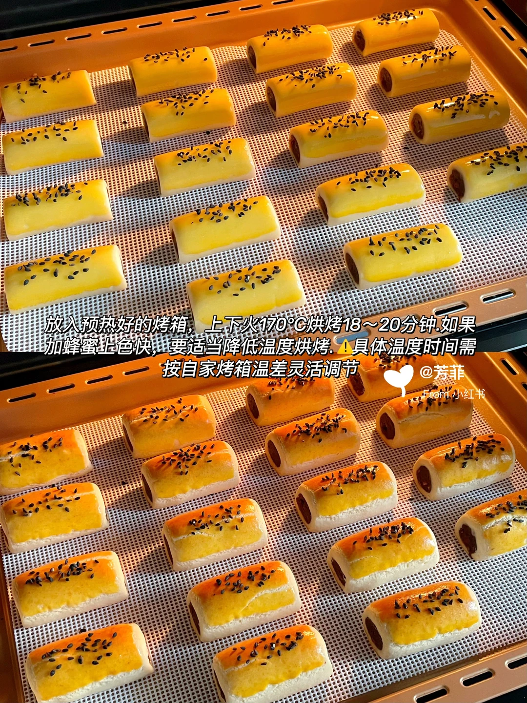 5️⃣放入预热好的烤箱,上下火170℃烘烤18~20分钟左右.如果加蜂蜜上色快,要适当降低温度烘烤.上色过早及时加盖锡纸,出炉晾凉再拿取⚠️具体温度时间需按自家烤箱温差灵活调节