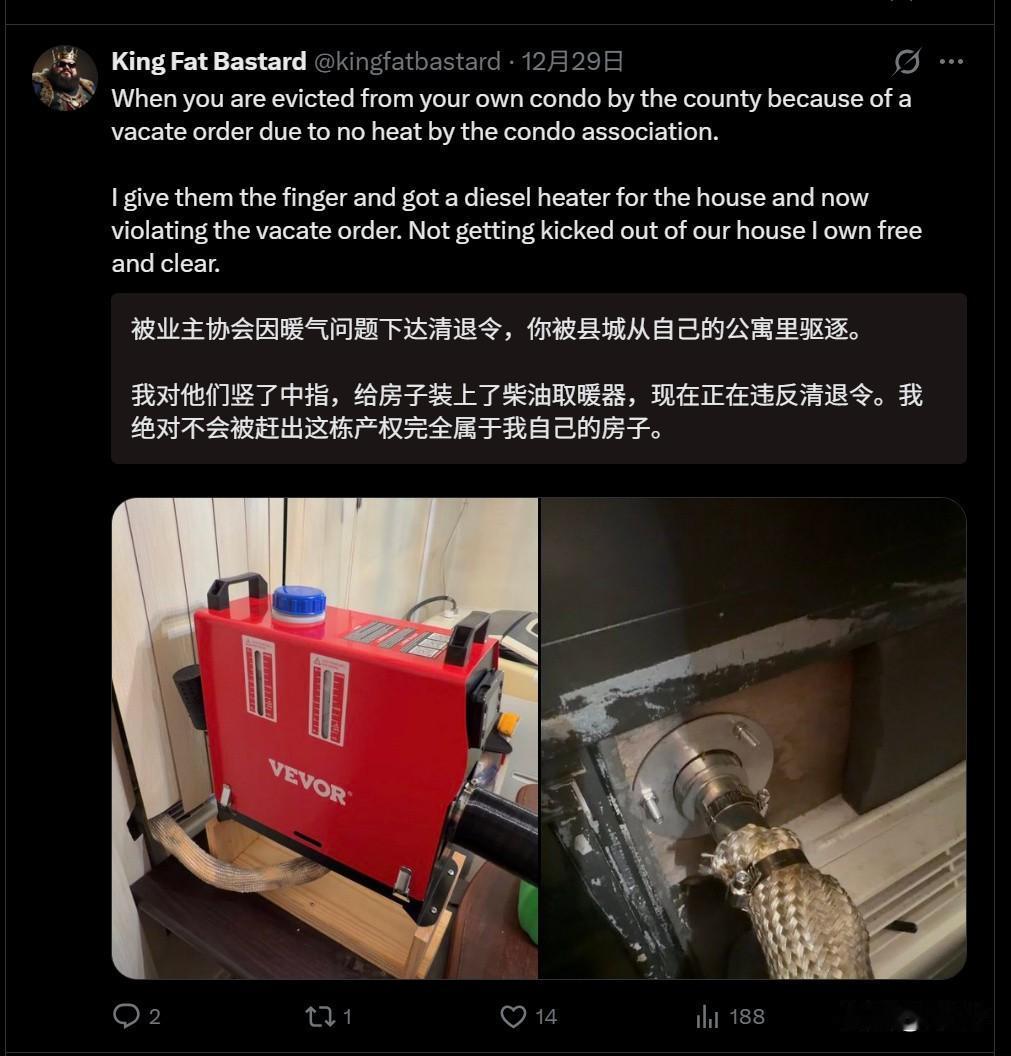 马里兰州那个“美国老爷们心善,见不得穷人住在没有暖气的屋子里”故事,还有新的后续。这个卡车司机哥们儿不是说他违抗了当地美国县政府下达的撤离令,给自己安装了一台柴油暖气,然后搬回去了吗?他准备跟当地对抗到底,“我对他们竖了中指,给房子装上了柴油取暖器,现在正在违反清退令。我绝对不会被赶出这栋产权完全属于我自己的房子。”然后现在停电了。