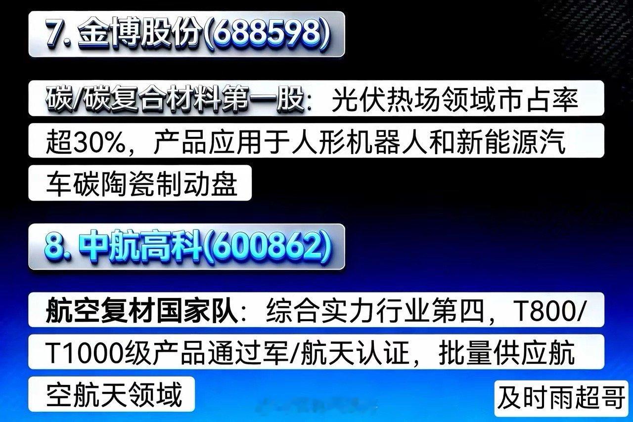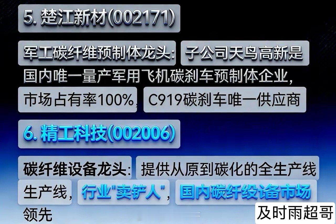 黑色黄金碳纤维国产替代8大龙头。日本人不仅垄断了90%的高端光刻胶,而且还垄断了70%的高端碳纤维材料。是否断供,全凭他心情。因此高端碳纤维国产替代迫在眉睫。国产碳纤维八大龙头:(名单仅供参考,不做投资依据)。1. 军工碳纤维龙头光威复材。2. 民用碳纤维领军者中复神鹰。3. 高端军用碳纤维龙头中简科技。4.全球最大碳纤维原丝供应商吉林化纤。5. 航空碳纤维预制体龙头楚江新材。6. 碳纤维生产设备龙头精功科技。7. 碳/碳复合材料第一股金博股份。8. 航空复材国家队中航高科。
