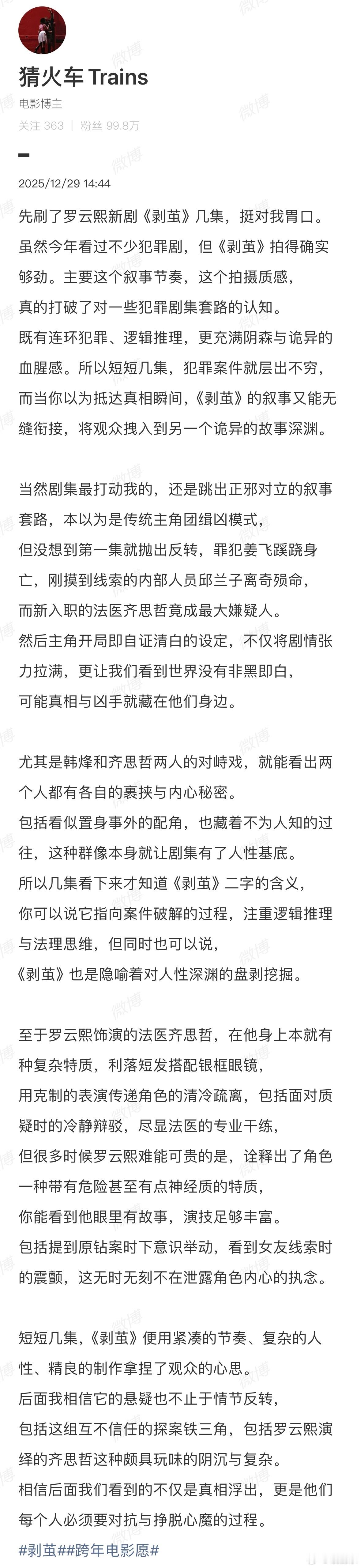 剥茧烧脑又好看追平《剥茧》的我直接封神,案件猎奇不悬浮,推理逻辑全程在线,节奏快到让人不敢快进,前四集的高能反转已经把悬疑瘾狠狠勾住了。