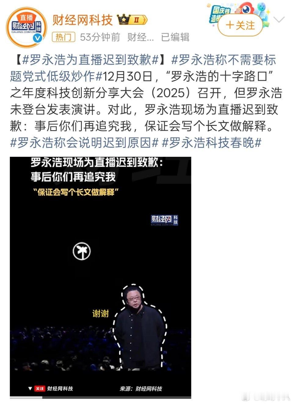 罗永浩迟到超40分钟罗永浩迟到这么久,迟到的原因不能现场先给个解释吗?还说什么后面写长文做解释,后面谁还关心这件事啊,真是长见识了。