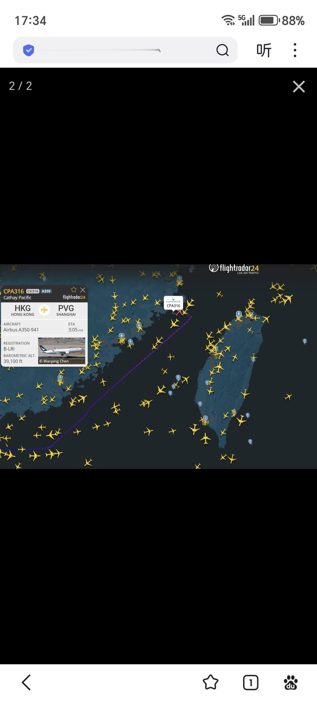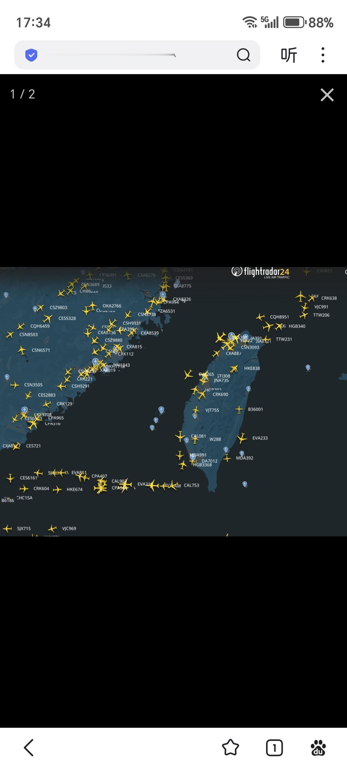 根据航空跟踪网站 F24 的数据,与昨天相比(图2),目前海峡内民用航路上已经净空(图1)