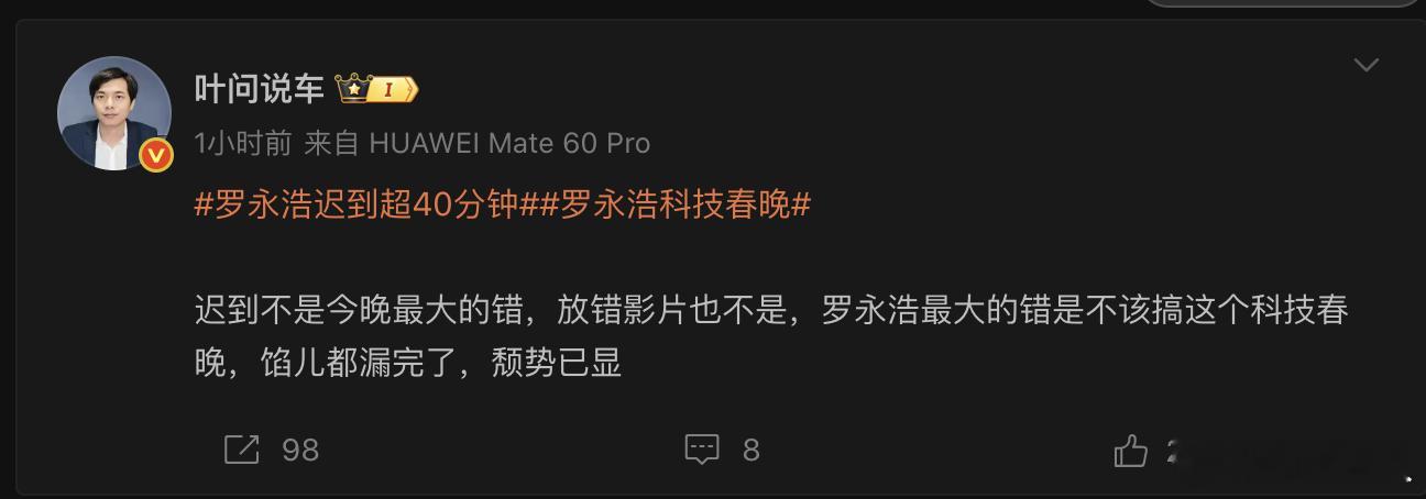 罗永浩迟到超40分钟迟到确实不是最大的错儿,放错影片就是罗永浩经常在台上调侃工作人员来调动气氛的手段而已,这科技春晚确实让很多人失望了,但是 说的露馅儿是啥意思?我不明白罗永浩能露啥馅?你倒是挺容易露馅儿的罗永浩科技春晚十字路口年度发布会罗永浩年度发布会
