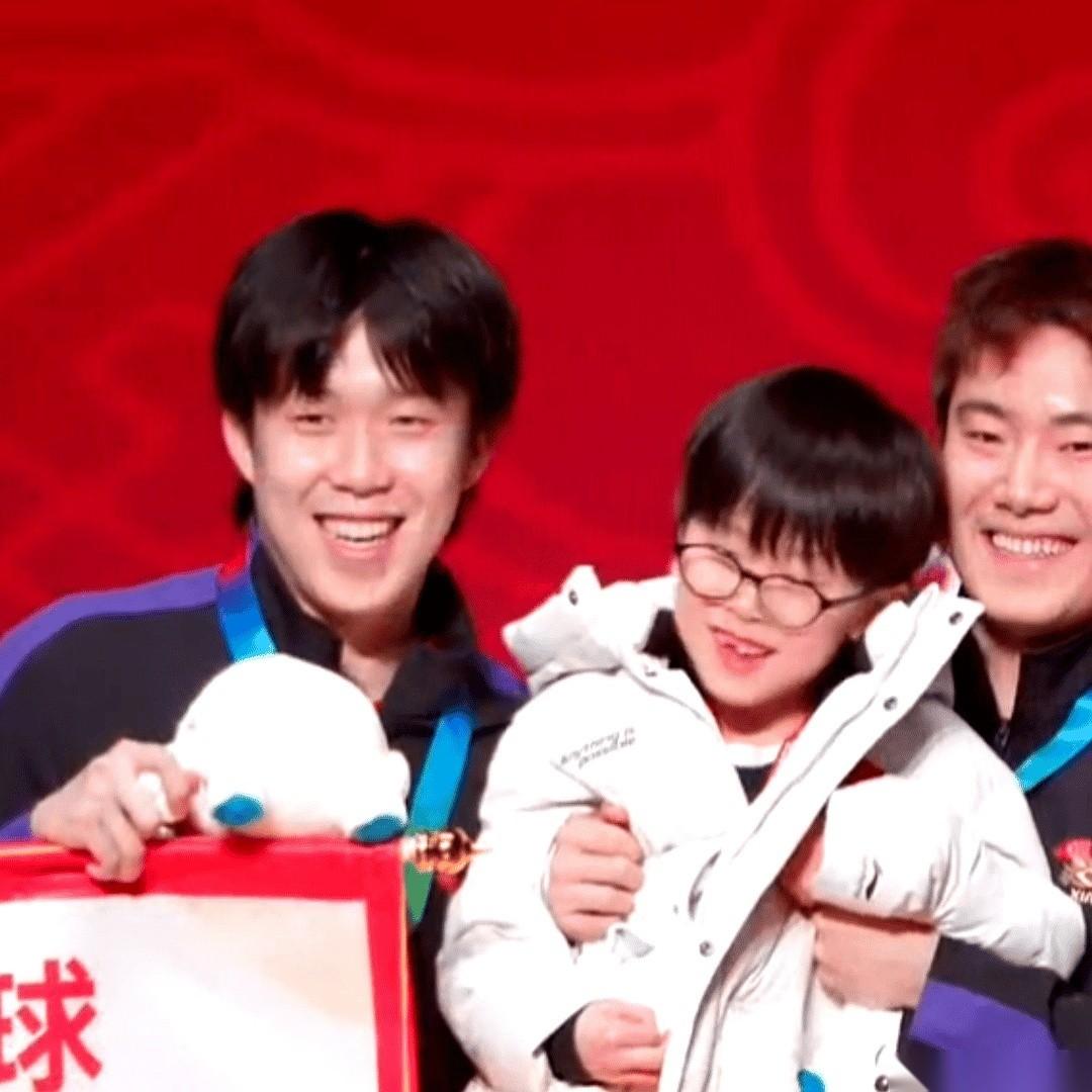 乒超总决赛,颁奖台的合影环节。 梁靖崑一脸骄傲地把他儿子“凉皮”抱上台,往自己和