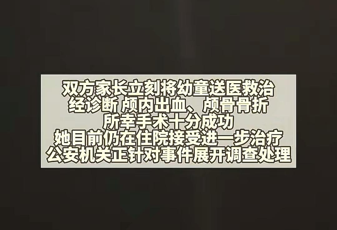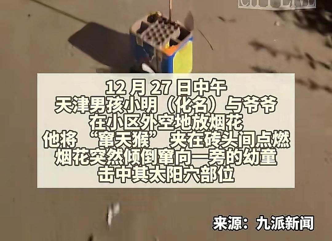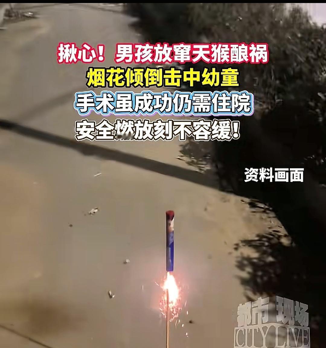 天津一个男孩放窜天猴, 烟花倾倒击中幼童太阳穴, 事发后,双方家长第一时间冲上去,赶紧把受伤幼童送往医院救治,这份及时的救助让人稍感安慰。可检查结果还是让人揪紧心,孩子被诊断出颅内出血、颅骨骨折,尽管手术做得很成功,如今仍在医院接受进一步治疗,公安机关也已经介入调查。 家长带孩子放烟花,绝不能心存侥幸,危险烟花要远离、燃放方式要规范,更要时刻留意周围的人群。