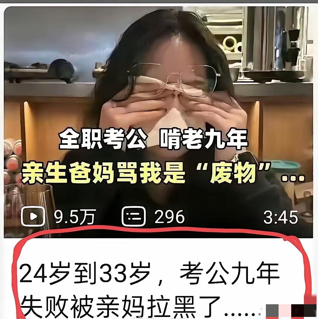 全职考公,啃老九年,亲生爸妈骂她是“废物”,还拉黑了她微信! 不知道这个报道是否是真实的?如果这是真的,故事的后续或许藏着现实最刺骨的清醒。 一个女生花费人生最宝贵的九年,一心扑在考公上,图啥?不就是图一个工作稳定,只是这个代价太大了。 九年考公都没考上,我有理由怀疑,她是不是考试能力太差?根本不适合考公? 我想她父母定然早就劝过,从最初的温声细语“先找份工作,边做边考”,到后来的厉声质问“你到底有没有真的努力过?” 她好像一直活在自己编织的“考公上岸”的梦里,觉得只要坚持下去,总能等来柳暗花明,却忘了梦的根基,从来都不是虚无的执念,而是脚踏实地的付出。 说真的,如果我是她父母,我也会那么做,这样的大龄婴儿,到底那么坚持有啥用?换来的只有一次次的失望,失望和失望…… 大家对此怎么看?