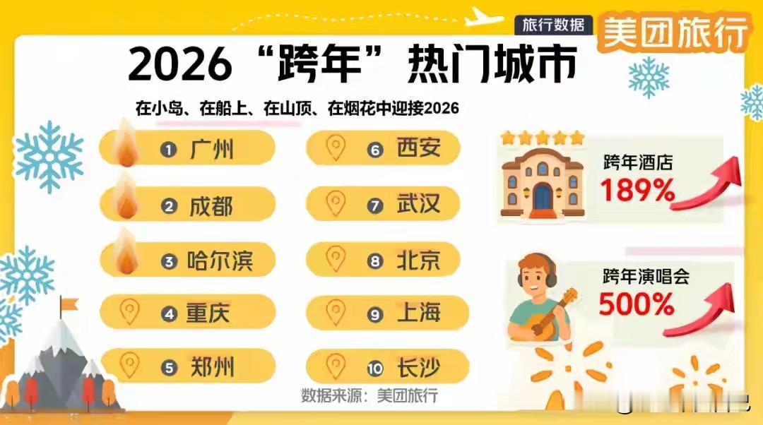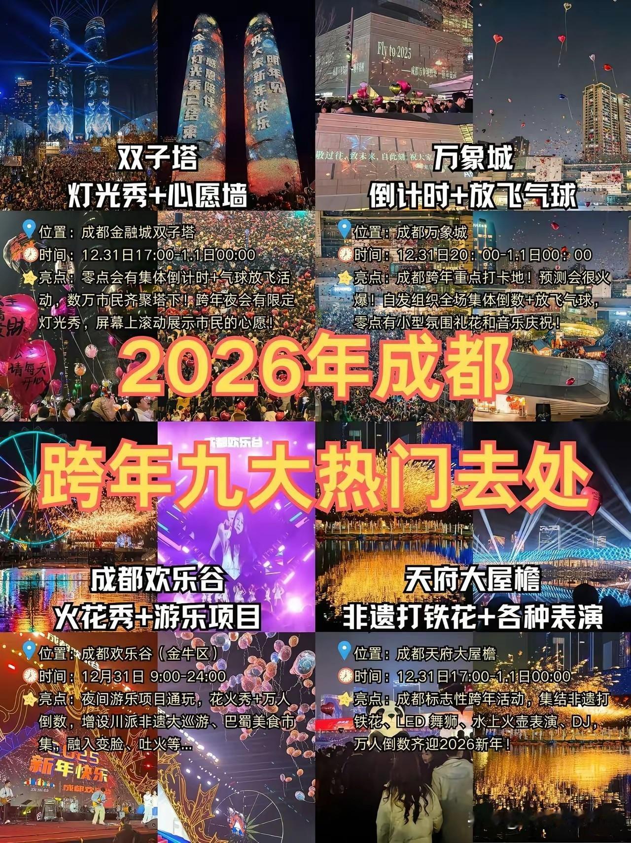 玩转跨年经济,成都放出大招! 大家有没有注意到,这些年国内城市对跨年活动越来越重视了!公众的参与热情也年年上涨。每年年底,很多大城市就开始组织酝酿丰富多彩的跨年活动! 作为西部有重大影响力的城市,成都每年的跨年活动都搞得有声有色,吸引了许多外地游客前往凑热闹。 今年也不例外!根据美团发布的数据,成都是国内跨年热门城市热度排名第二的城市。 成都凭什么再一次成为跨年热门目的地城市呢? 首先,成都这个城市本身自带网红特质,其丰富的旅游资源和独特的休闲氛围对很多人具备天然吸引力。 其次,今年的跨年,成都的活动呈现多点位多层次多元化,从不同的内容精准吸引各类游客。从高新区金融城双子塔的灯光秀和许愿墙,到天府国际会议中心大屋檐的非遗打铁花和水上火壶、LED舞狮,再到锦江区的“夜游锦江”,还有万象城广场的跨年倒计时和放气球,非遗博览园的千灯会,成都欢乐谷的跨年大夜场…… 总结一下来说,在成都可以选择光影跨年、非遗跨年、冰雪跨年、音乐跨年、灯会跨年…… ,今晚,从2025年迈入2026,成都一定会成为一个欢乐的海洋!