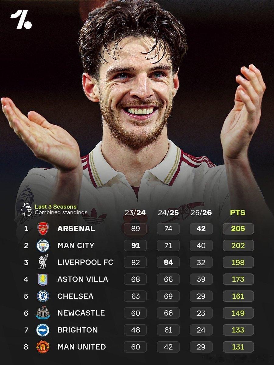 总感觉英超联赛好像亏欠了阿森纳一样! 看了一下数据统计,2025年年度英超积分阿森纳39场83分傲视群雄,就连曼城都要退避三舍。 再看看过去三年,阿森纳总积分达到了惊人的205分,同样压202分的曼城一头。 拿了这么多分却拿不到任何冠军,英超联赛是不是应该反思一下了! 要不然改改规矩吧,要不然就年底颁奖,要不然就给阿森纳颁发一个三年总冠军! 这样才算合理吧! 你说对吗?