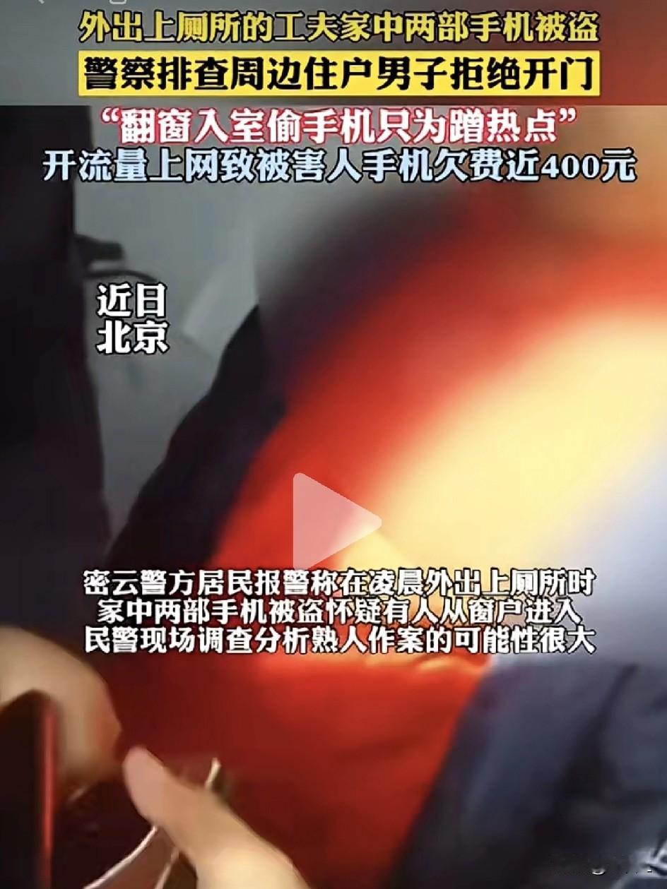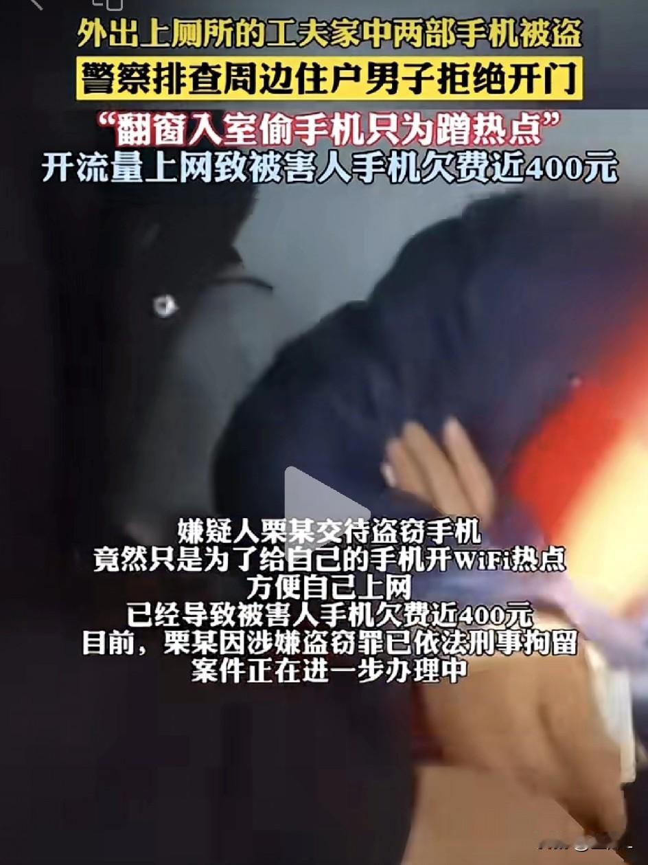 半夜偷手机只为蹭WiFi?北京一男子“神操作”把自己送进班房! 听说过偷手机卖钱的,听说过偷手机自用的,可您听说过偷手机就为开热点上网的吗? 最近北京密云就有这么一位“奇葩小偷”,上演了一出让人哭笑不得的深夜闹剧。 前几天凌晨五点多,天还没亮,密云一位居民迷迷糊糊起床上厕所。十分钟后回屋一看——枕边两部手机没了!窗户还透着风。得,这是遭贼了! 报警后,刑侦支队的警官火速赶到现场。一查监控、二看环境,警官心里有谱了:“十分钟作案,路线熟悉,这八成是熟人干的!” 民警开始挨家挨户走访排查。 大多数邻居都积极配合,可到了某户门前,却吃了“闭门羹”。里面的人支支吾吾不肯开门,声音还透着慌张。 “不对劲!”民警果断敲门。门开了,一名男子眼神躲闪,更奇怪的是——大冬天在屋里,他腰间却鼓鼓囊囊塞着件小棉服。 “您这怀里揣的什么宝贝?”民警一问,男子顿时冷汗直流。 民警一检查,好家伙!棉服里正藏着报警人丢失的两部手机。人赃俱获,男子当场蔫了。 带回派出所一问,作案动机让民警都听懵了—— “我偷手机…就是为了开热点,给自己手机上网用。” 原来,嫌疑人栗某自己的手机流量不够用,竟想出这么个“馊主意”:偷别人手机,开WiFi热点当“移动路由器”! 更绝的是,他蹭网太狠,直接把被害人的手机用欠费近400元。 目前,栗某因涉嫌盗窃罪已被刑事拘留。真是应了那句话:“偷鸡不成蚀把米”,想蹭网结果把自己“蹭”进了班房。 网友神评论: “这是年度最费流量小偷” “建议运营商给他颁个‘拼命三郎’奖” “有这心思去营业厅办个套餐不好吗?” “手机不值钱,入室盗窃就重了。看怎么判吧!” “一夜欠费近400!这是用来干嘛了?” 临近年关,警方特别提醒: 👆家里别放大量现金,贵重物品收收好! 👆防盗门、C级锁、报警器,该装都得装! 👆半夜睡觉关好窗,听到动静莫慌张! 👆一旦发现被盗,立即报警保现场! 这年头小偷也开始“技术流”了,可惜心思没用在正道上。 还是老老实实挣钱办流量卡吧,毕竟——免费的“热点”,可能让你的人生“凉凉”! 素材来源:半岛晨报,侵联删!