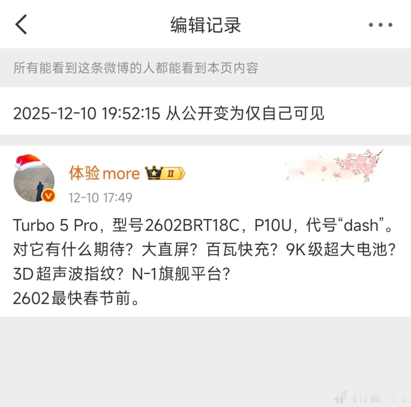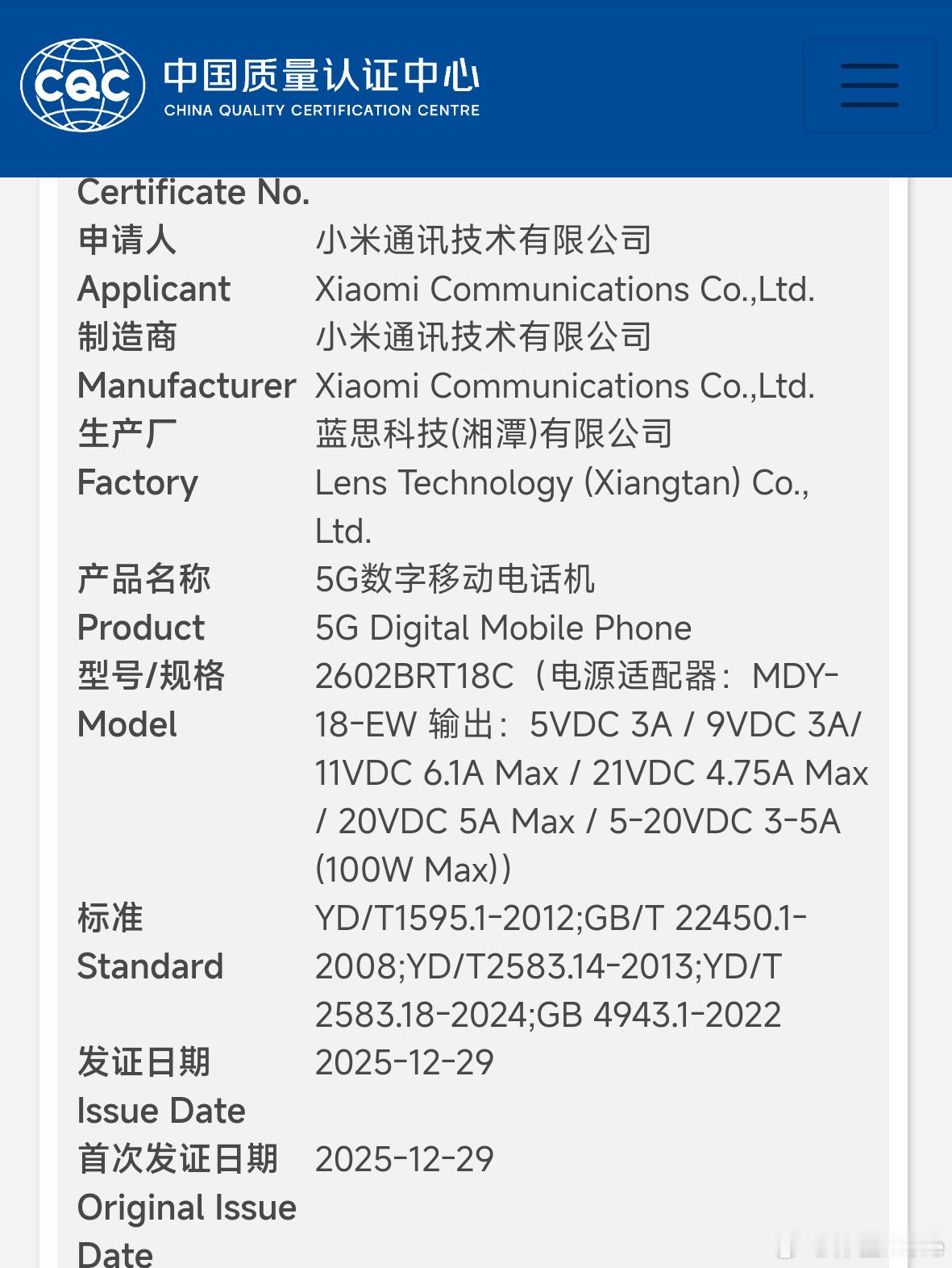 REDMI Turbo 5系列通过认证,都是100W快充。REDMI Turbo 5,2511FRT34C,P10,代号“klee”。REDMI Turbo 5 Pro(Max),2602BRT18C,P10U,代号“dash”。625亿元国补提前下达手机产品最快明天可享国补。Turbo5系列比如1999/2299起售的话,国补价就是1699/1954。