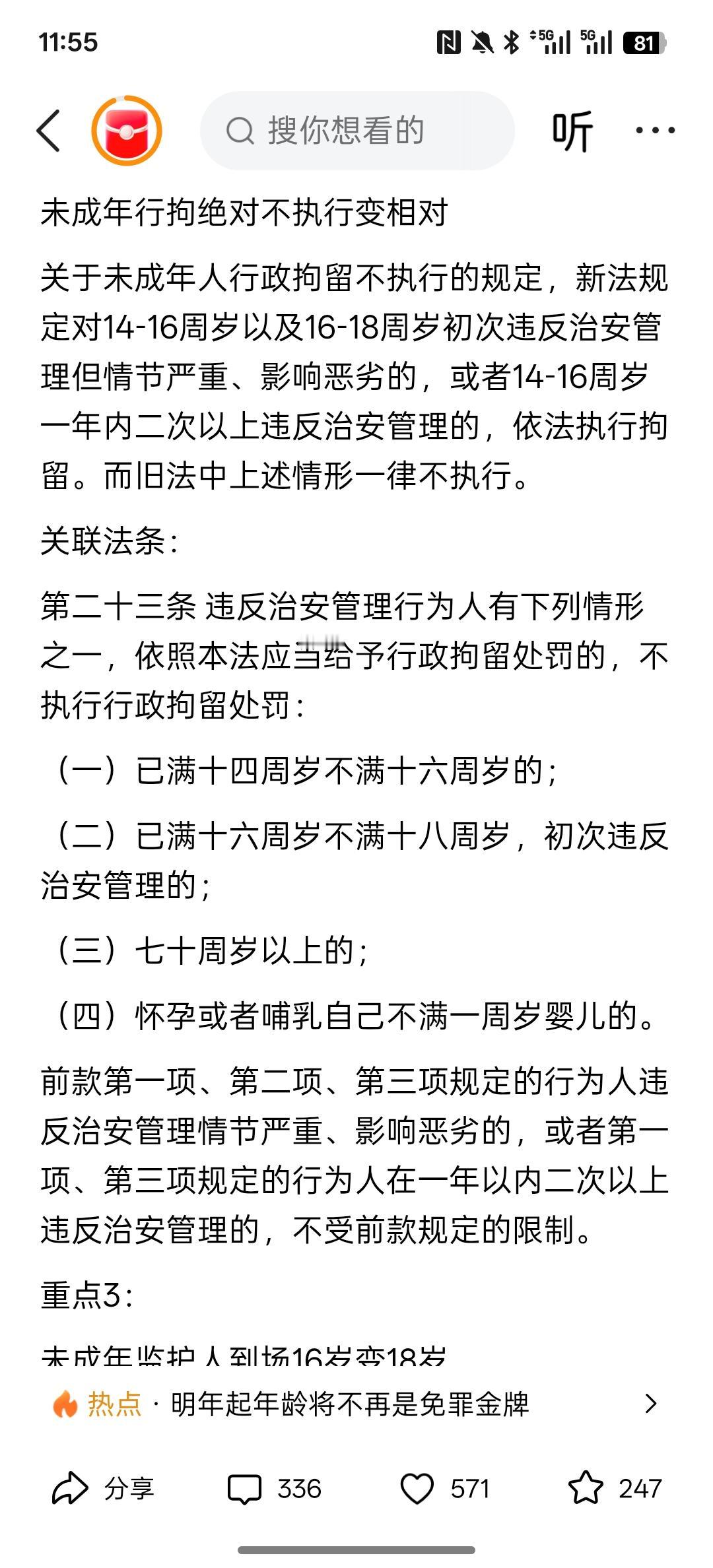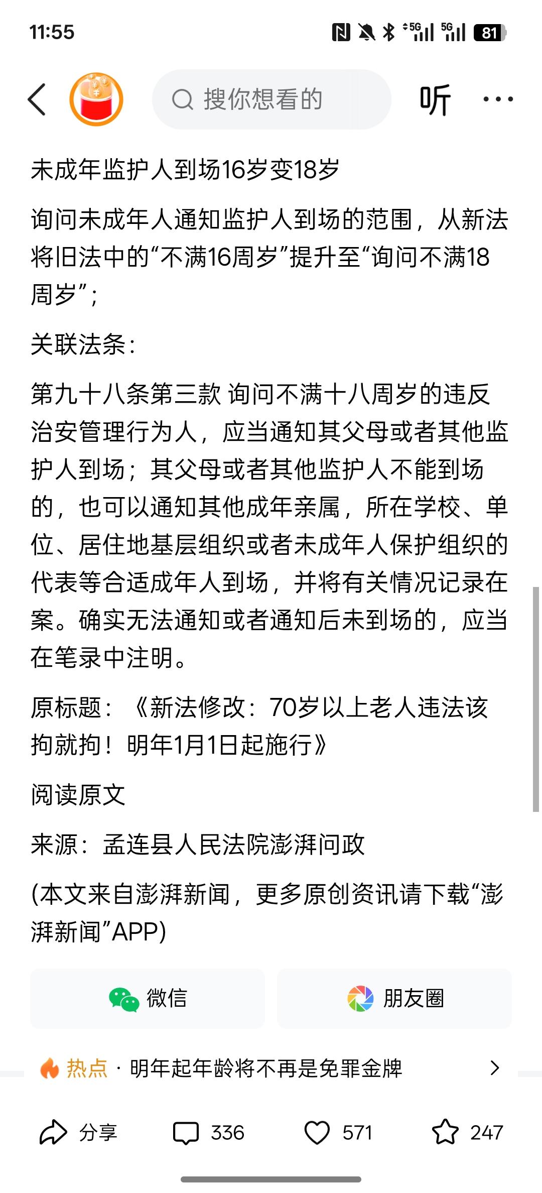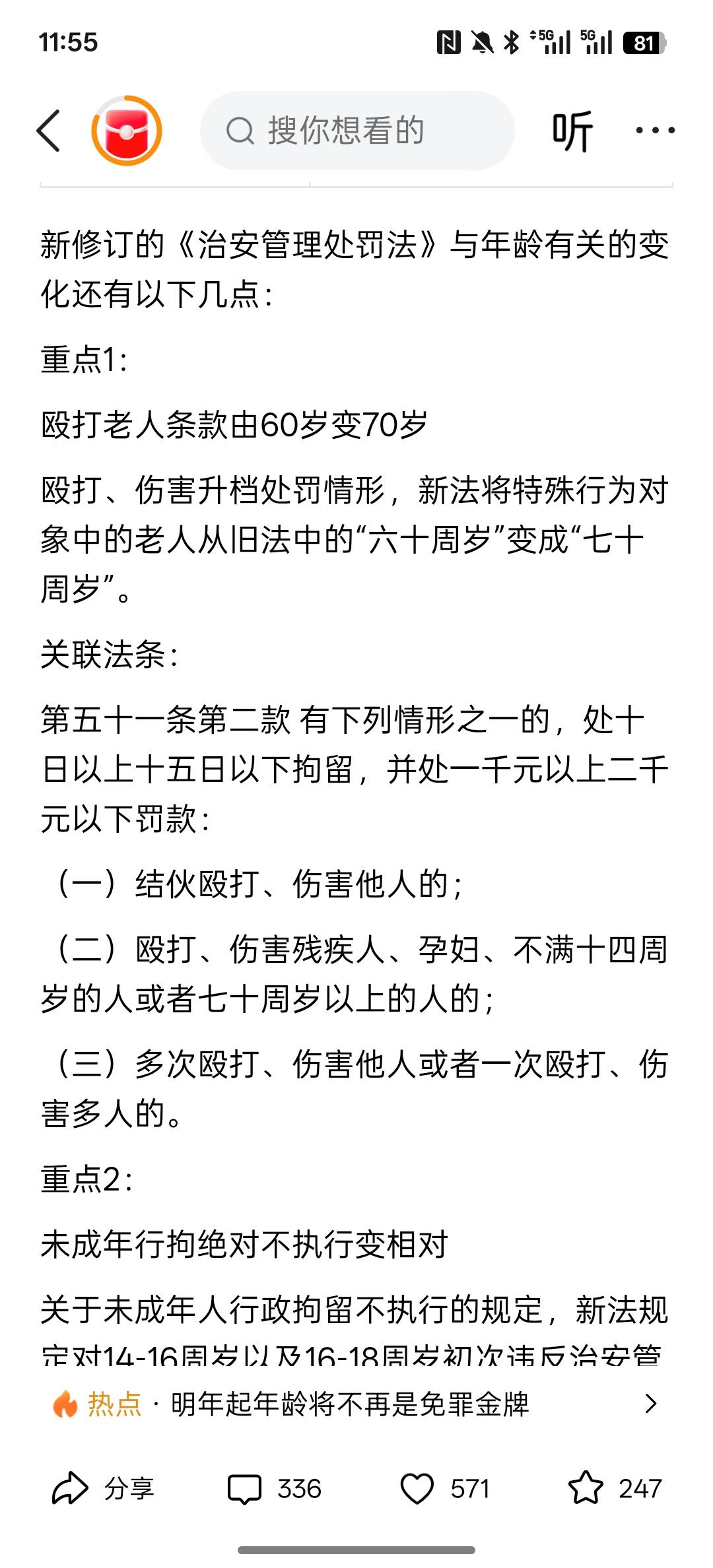 年龄不是免死金牌,新法修改:70岁以上老人违法该拘就拘!明年1月1日起施行,就有类似很多年纪大的老人,地铁公共场合闹事,仗着自己年龄大,法律上没有明文规定寻衅滋事闹事,没办法,拘留跟刑事,现在,按照新法律规定,那你70岁照样可以刑拘留,拘留,关押不是年龄大就不负法律责任,以后还要仗着年龄大倚老卖老就有的你受累!