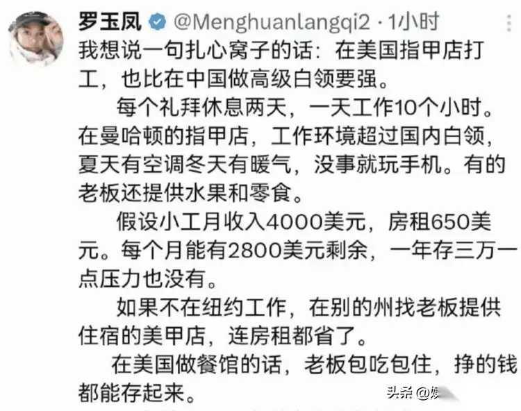 润到美国的凤姐,一直叫人们不要关注她,免得她找不到老公。 却又偏偏爱出风头,她又出来聊美国生活。 聊美国生活就聊美国生活,偏偏又爱同中国对比。 说在美国做做修脚工,一个月挣4000美元,也要比在中国做白领强。 有网友计算过,在美国4000美元,交完各种税和生活支出,每个月存不下2000美元。 一旦有什么大病,别说存款,不欠债就不错了。 更何况,老美那边还有一个斩杀线。 “斩杀线”不是开玩笑的,稍有意外就可能直接跌下去。