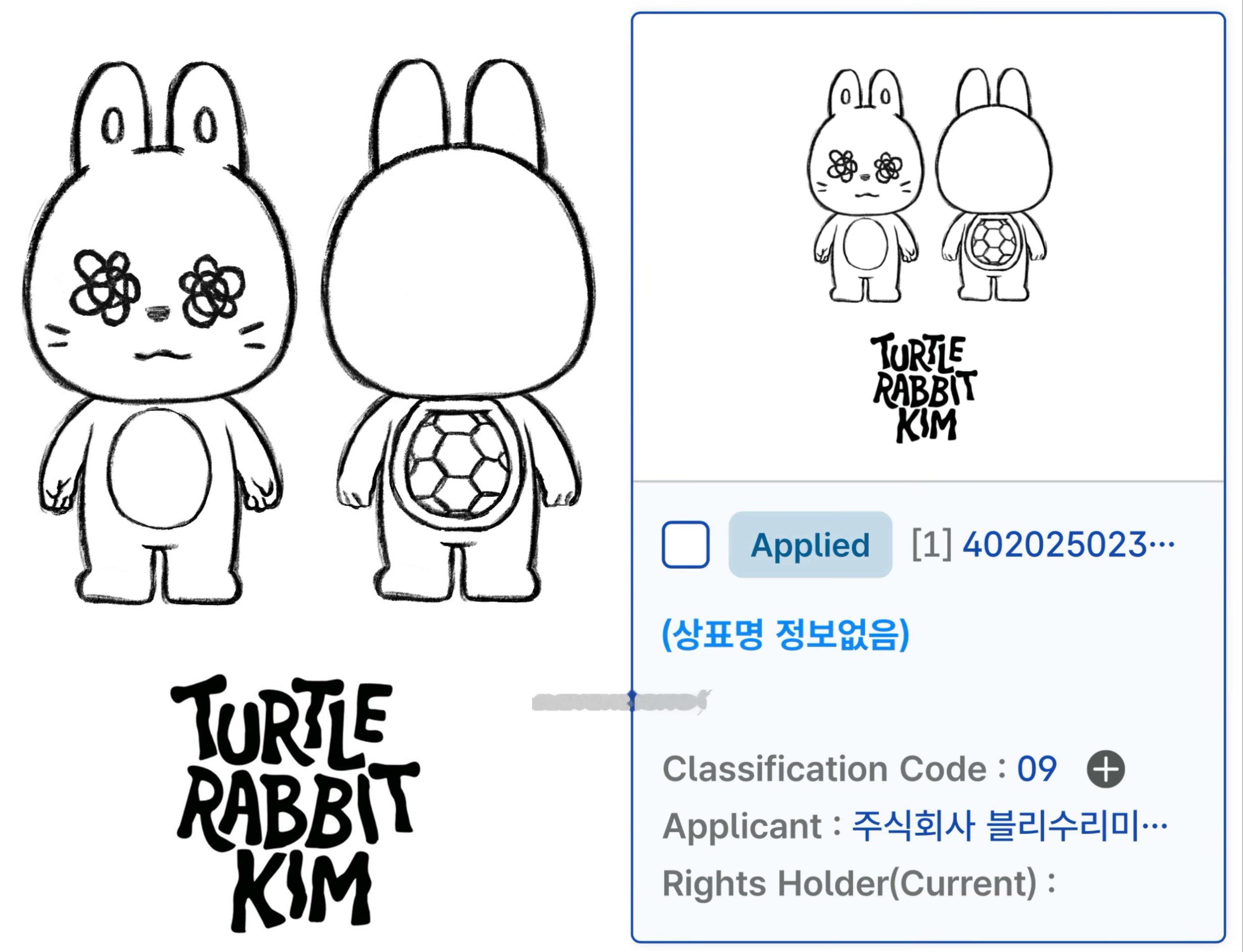 Jisoo已在KIPRIS(韩国知识产权信息服务)上提交了该图像和“TURTLE RABBIT KIM”文字的商标申请🤩闹木Kiyo!!!!!