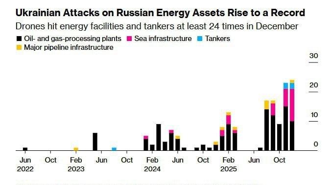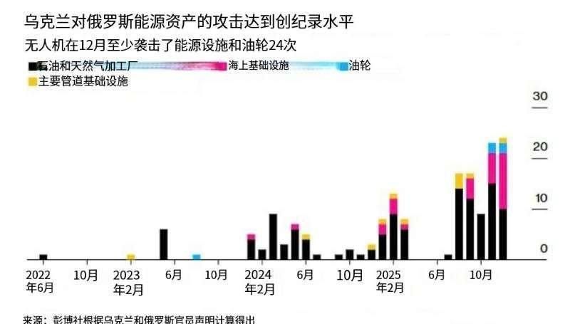 据彭博社报道,乌克兰在2025年12月加大了对俄罗斯能源基础设施的袭击,实施了至少24次袭击,这是自俄乌战争开始以来月度袭击次数最多的一次。 ➡️这些袭击目标包括俄罗斯各地的炼油厂、输油管道、油轮、港口以及近海能源设施。