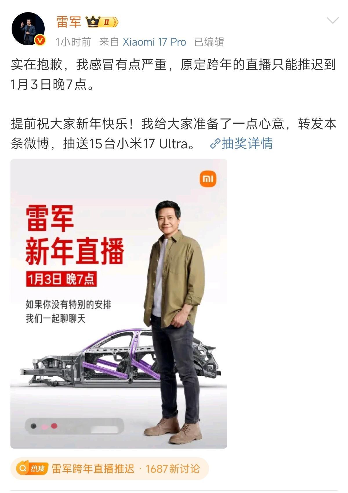雷军跨年直播推迟 雷总身体不舒服,没办法得休息一下。这次直播最大的亮点还是拆车,印象中车企自己直播现场拆车好像不多吧?最近北京天气容易感冒,大家也多注意防护一下