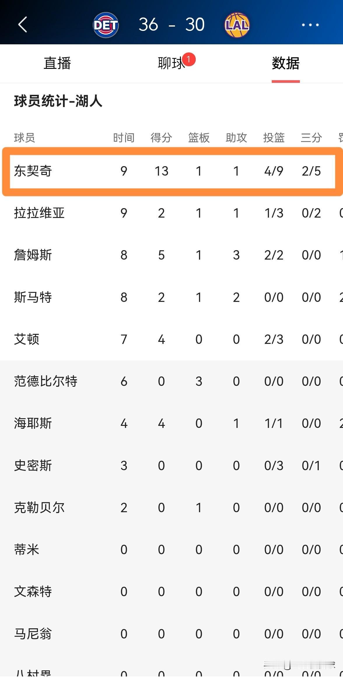 湖人当家球星东契奇真是太不懂事了!在今天湖人主场迎战活塞的比赛中,目前双方的第一节比赛已经结束,湖人以30:36落后于对手。众所周知,今天是詹姆斯的41岁生日,可是在第一节比赛中,东契奇依然大包大揽抢戏成功。 在首节比赛中,东契奇首发出战9分钟,投篮9中4,其中三分球5中2、罚球3中3得到13分,反观老寿星詹姆斯仅仅得到了2次出手机会。